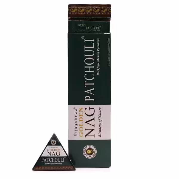 Jumbo Golden Nag – Patchouli Back Flow Incense Cones, a harmonious blend of captivating aroma and visual delight. Immerse yourself in the rich and earthy fragrance of Patchouli, an ageless scent that resonates with both traditional and modern sensibilities.