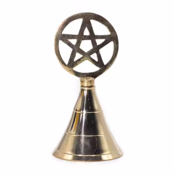 Handcrafted from solid brass, this altar bell is crowned with an openwork pentagram, symbolising protection, balanceand spiritual connection. At 10.5cm tall, it carries a satisfying weight and produces a clear, resonant chime.