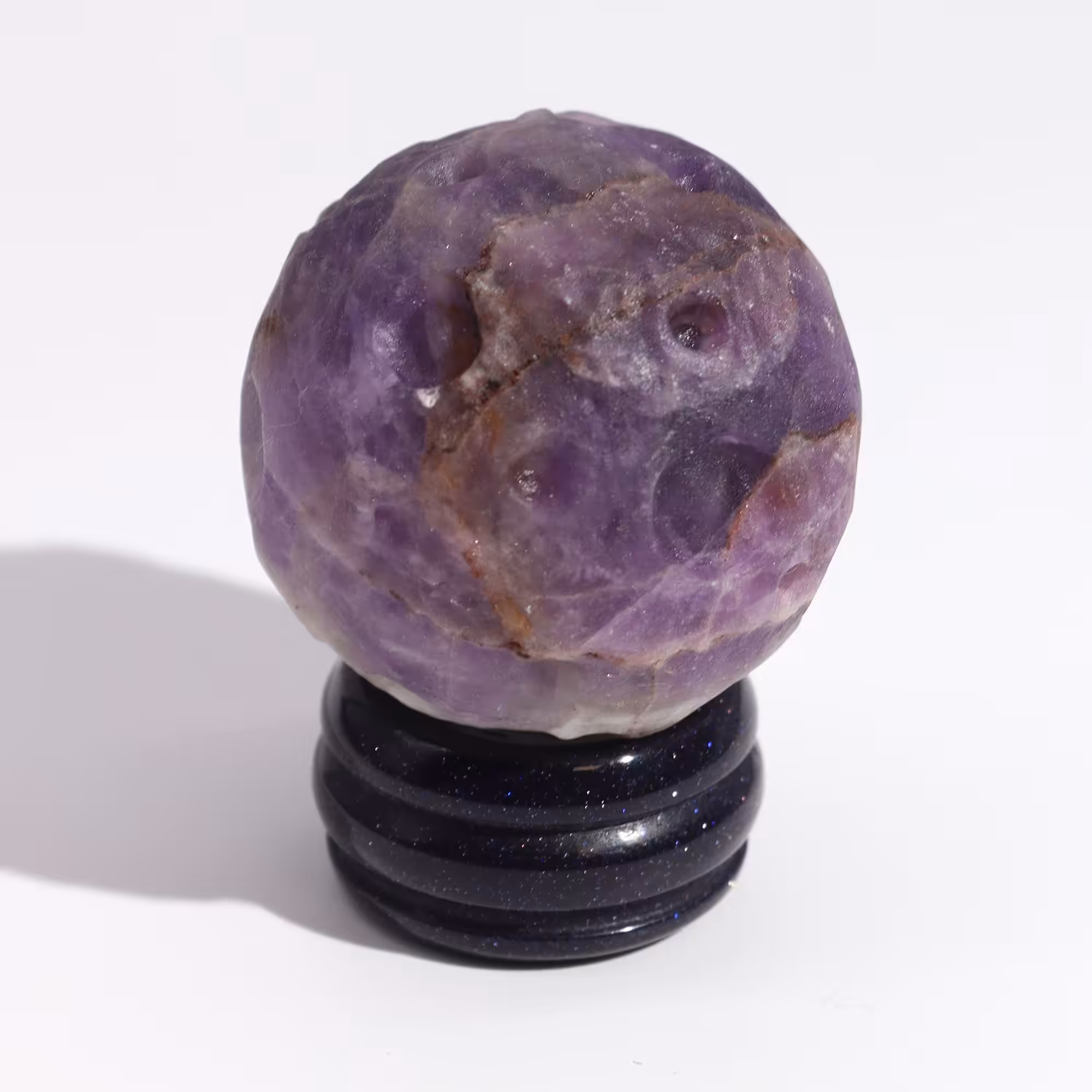 The Solar Goldstone Stand provides a grounding base for Amethyst sphere, reflecting the enigmatic beauty of the cosmos.
