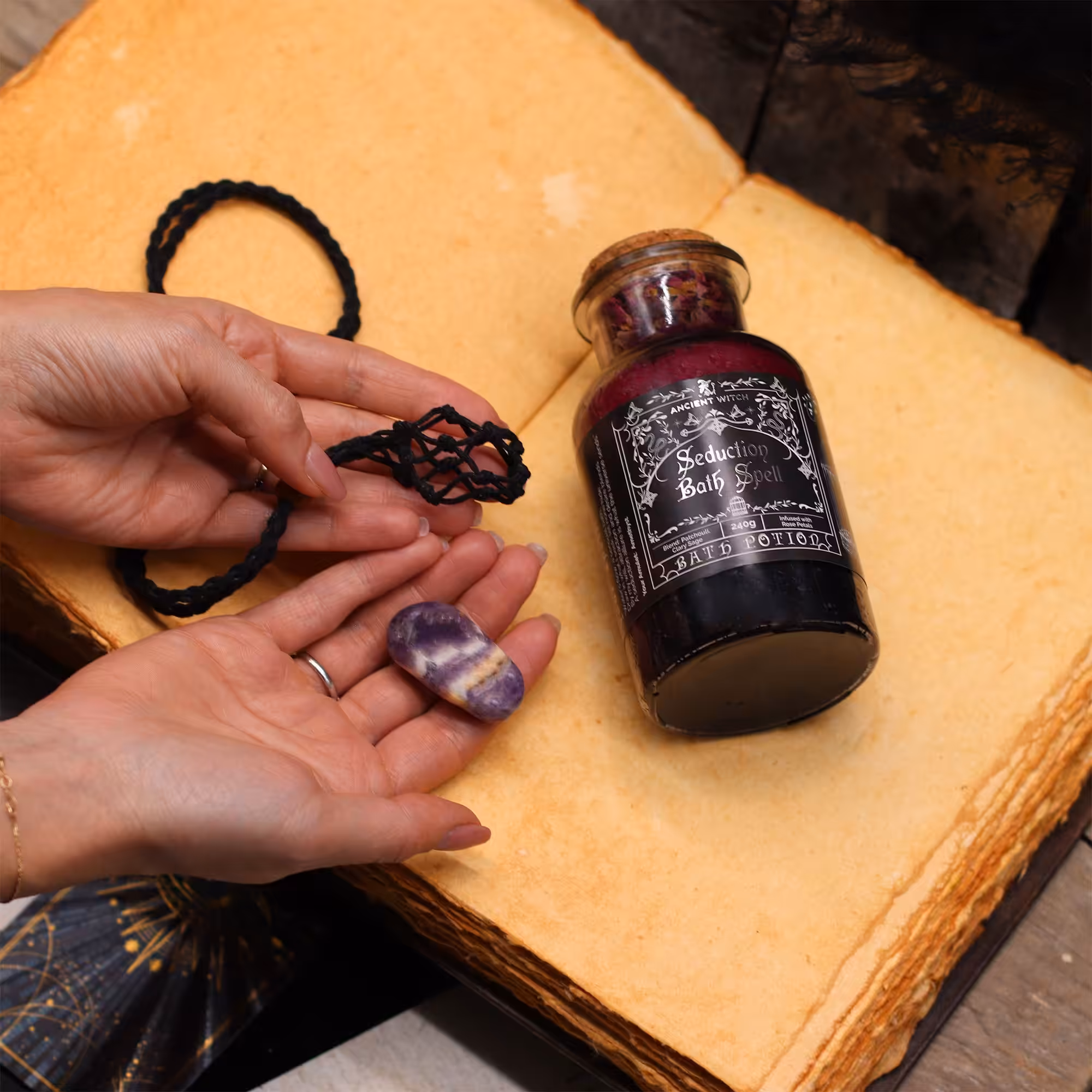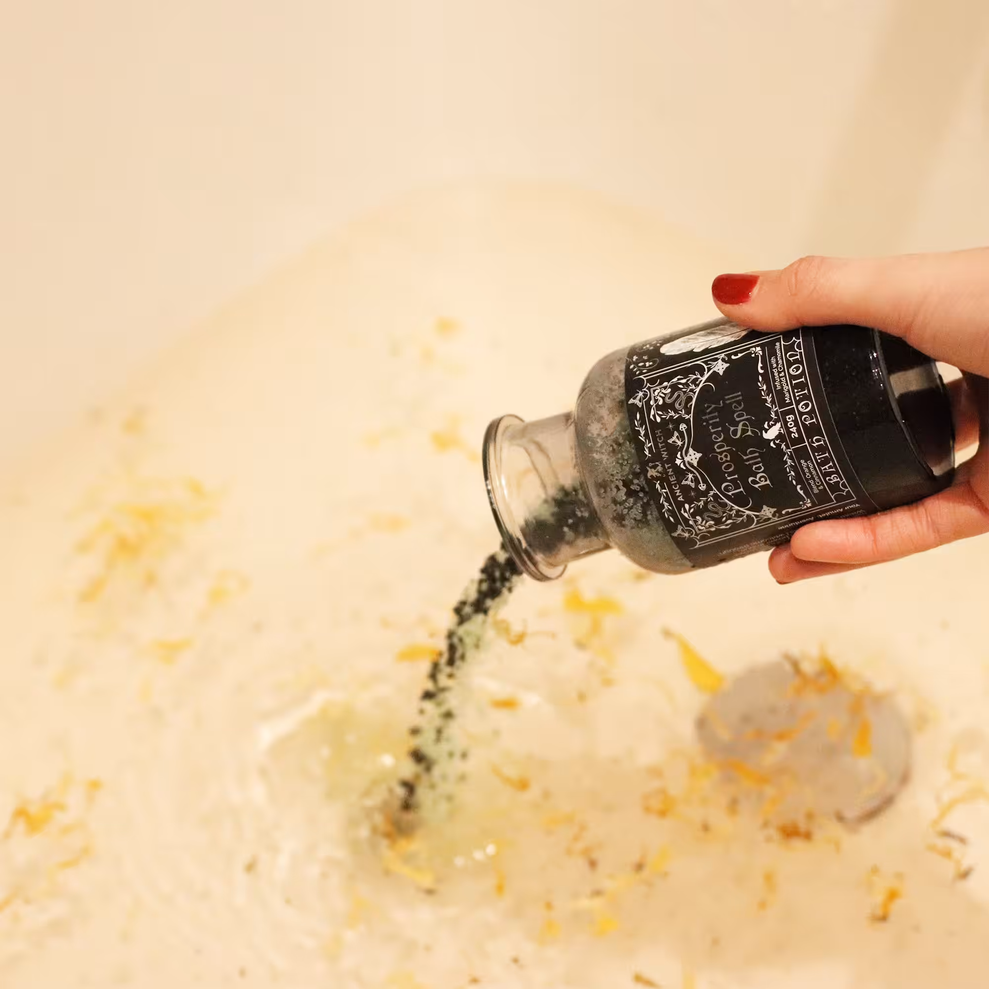 Step into abundance with the Prosperity Bath Spell Potion from Ancient Witch. This luxurious bath potion blends orange and cinnamon essential oils with marigold and chamomile, inviting positivity and growth into your life.