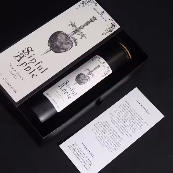 Perfect for love spells or confidence rituals, this candle stirs the energy of temptation and courage. The athame and apple evoke the thrill of pursuing what truly calls the soul.