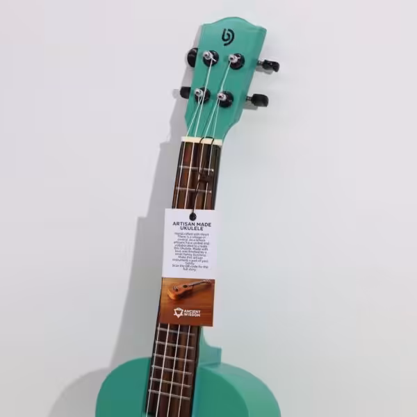 A beautifully handcrafted instrument from Indonesia. Featuring a stunning turquoise finish, this 4-string ukulele combines eye-catching design with excellent sound quality. Its high-quality craftsmanship ensures warm, rich tones that suit a wide range of musical genres.