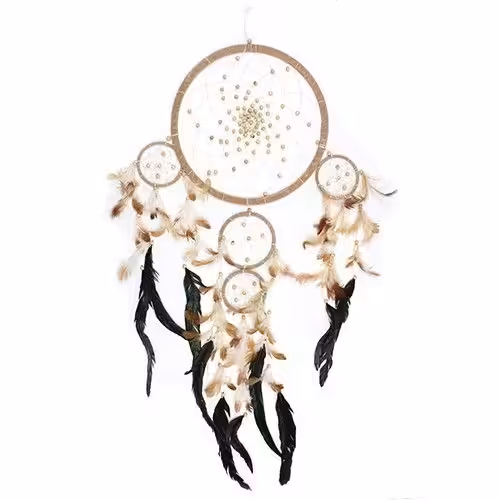 This hand crafted dream catcher features 17 cm wooden ring hand wrapped in cream, coffee and Chocolate suede cord, followed by one 11 cm and three 9 cm rings hanged on durable strings. All rings features cream strings with small wooden beads spiralling towards the centre. Hanging below are 11 sets of 4 feathers.