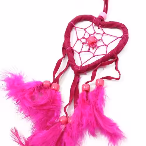This hand crafted dream catcher features 6.5 cm wooden heart hand wrapped in turquoise, pink and purple suede cord, followed by six 7 cm long same coloured feathers hanged on suede cords. The heart features same colour strings with small bead in the centre.