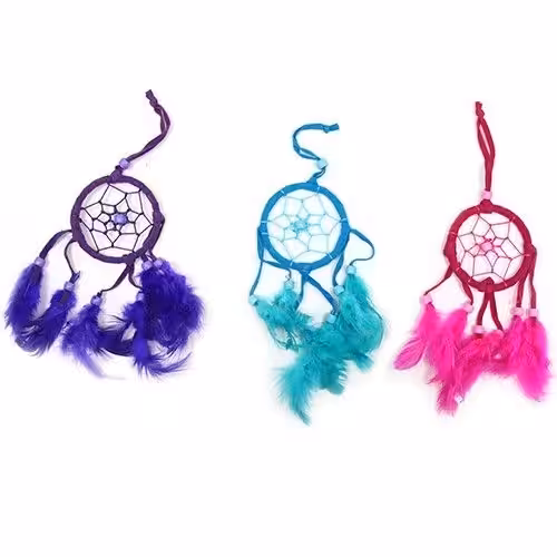 This hand crafted dream catcher features 6.5 cm wooden round hand wrapped in turquoise, pink and purple suede cord, followed by six 7 cm long same coloured feathers hanged on suede cords. The heart features same colour strings with small bead in the centre.