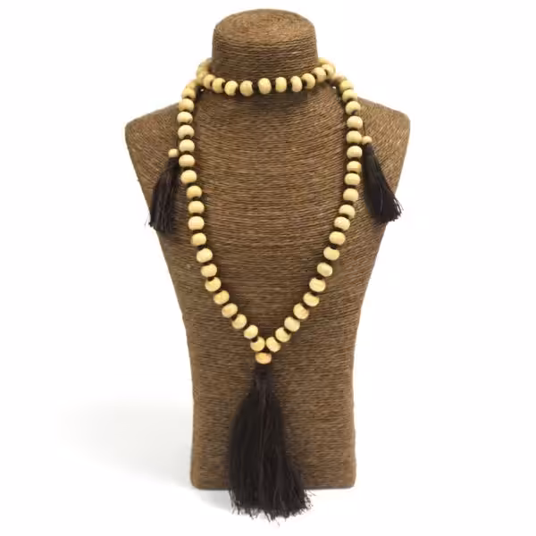 This handmade Bali necklace features 4mm smooth wooden beads on a strong brown string cord and finished off with a beautiful chunky 9 cm tassel and two additional small 5 cm tassels.