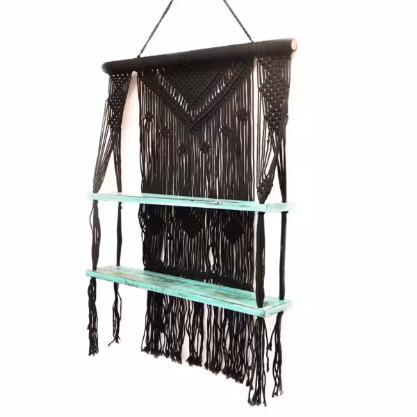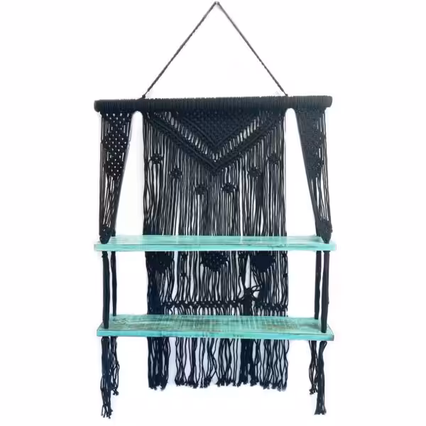One of the standout features of these shelves is their intricate macrame design, which not only provides robust support for your favourite decorative items but also creates a visually appealing backdrop. The vibrant turquoise accents beautifully contrast with the black macrame, making it an ideal choice to showcase plants, books or cherished trinkets. These shelves are perfect for adding a pop of colour and texture to any space, while also keeping your belongings organised and easily accessible.