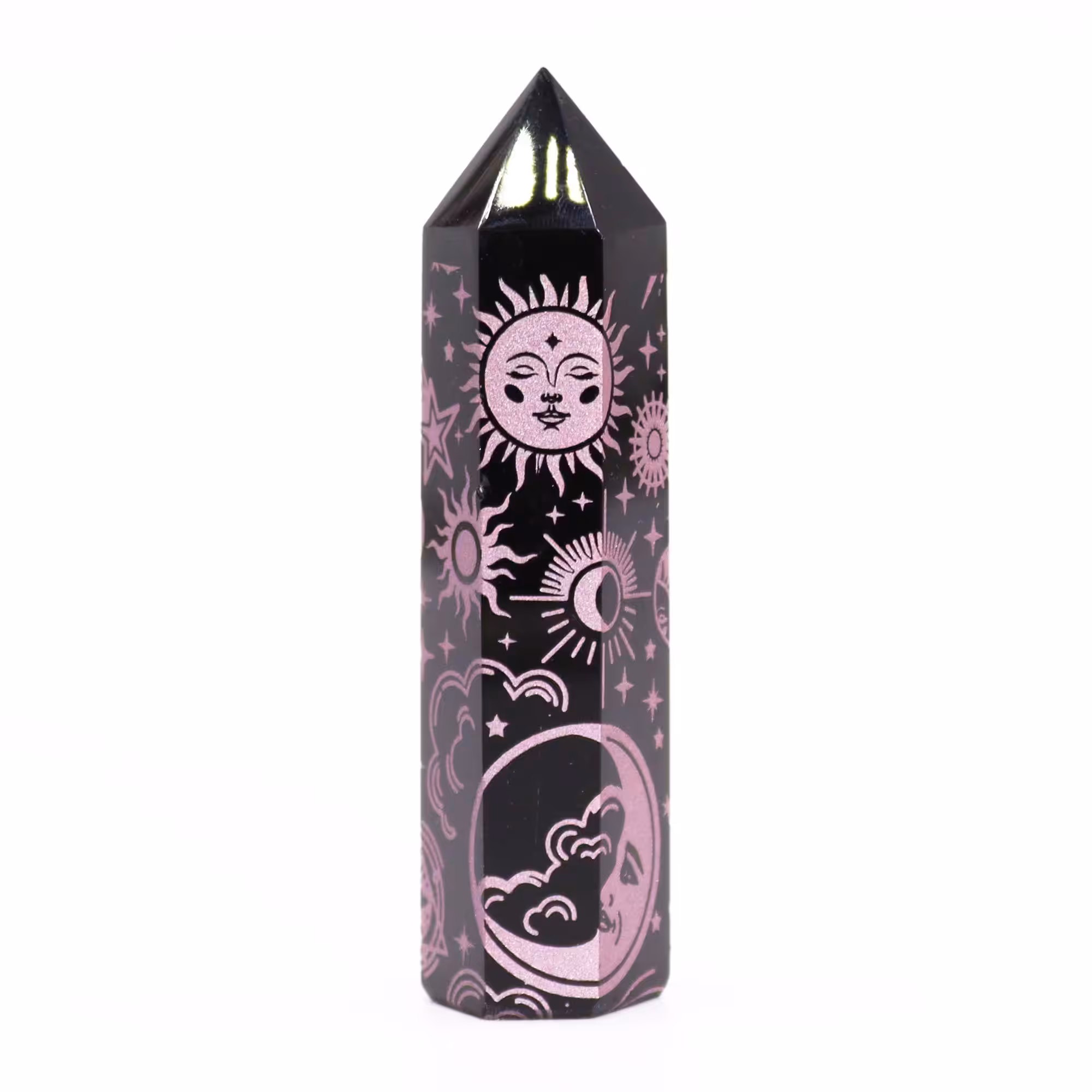 Introduce a touch of elegance and mystical energy to your collection with Black Obsidian Points, featuring delicate rose pink celestial designs. These points, each weighing around 60-70 grams and measuring 9 cm in height, combine powerful metaphysical properties with a charming aesthetic.