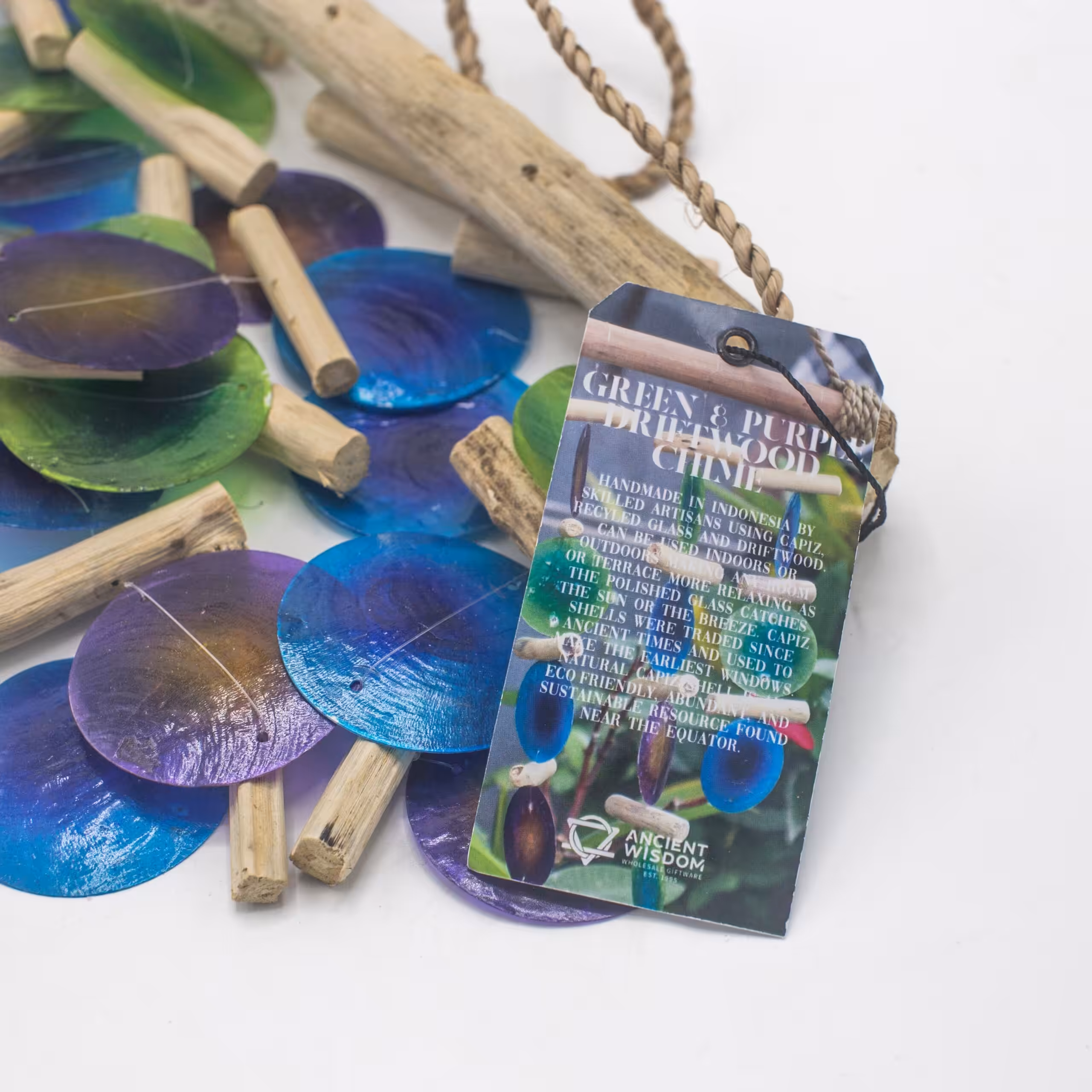 Bring nature inside with these absolutely beautiful Driftwood Chimes. Hand made by small family businesses in Bali, using beach source materials such as driftwood and Capiz glass. Capiz is a well-known shell that creates an enjoyable sound when blowing in the wind and bashing against another.