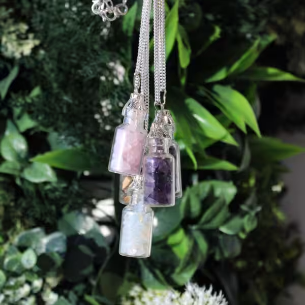 The pendant of this necklace is a beautiful and original bottle filled with tiny opalites. Opalite is an attractive stone because of its beautiful bluish sheen and mysterious glow. It is believed to be uplifting and create space. Chain length: approx. 50 cm