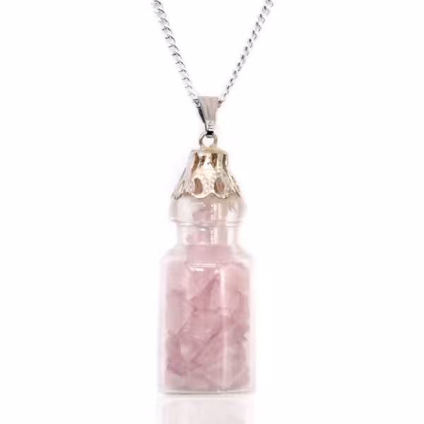 This necklace is actually a small bottle closed with a delicately decorated cap. Tiny pieces of rose quartz are placed inside. A beautiful and original gift idea, especially for women as this stone is considered to represent the feminine element.