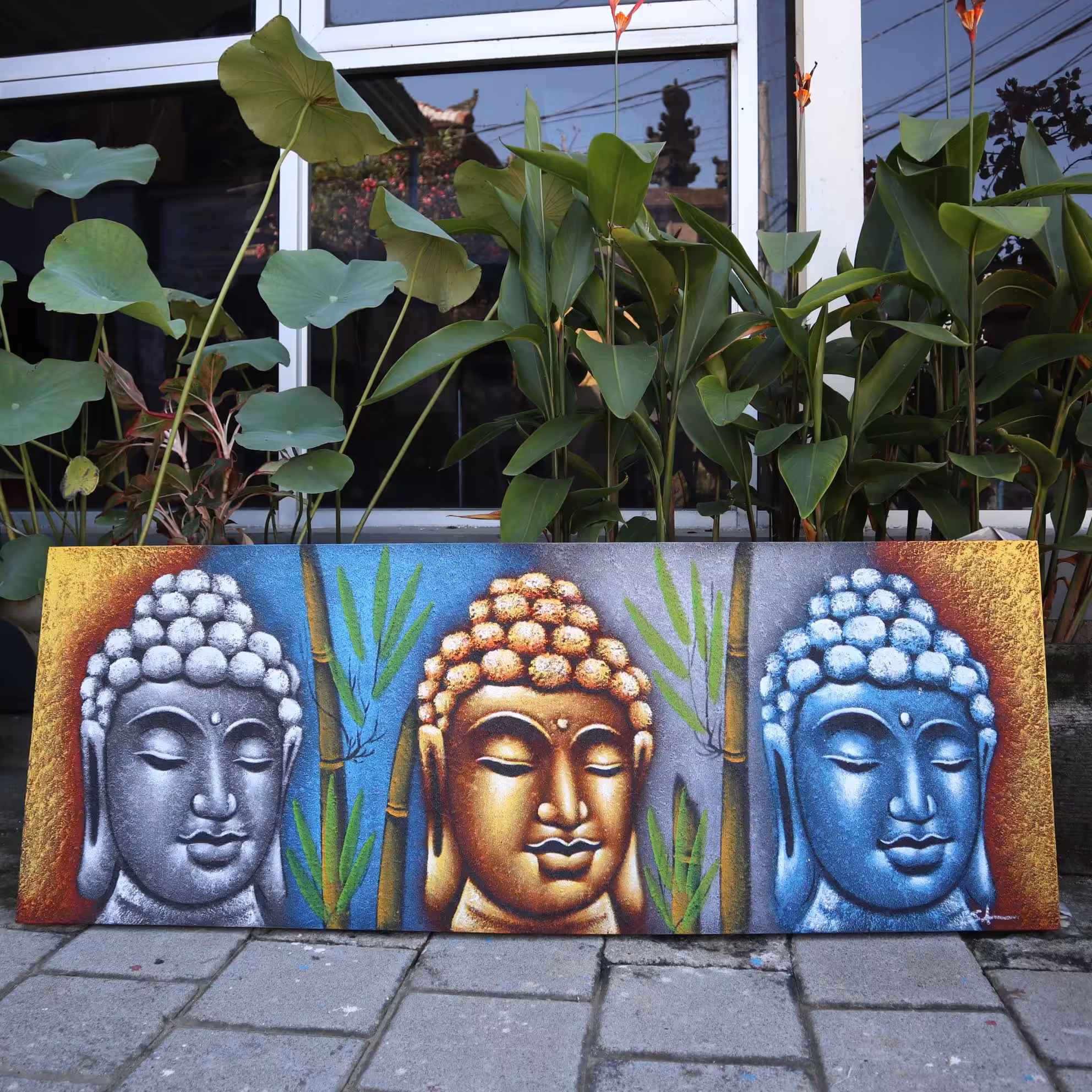 Add some elegance and culture to your home with this beautiful Buddha Painting. Handmade with passion and love with the finest canvas and natural wooden frames by Balinese artisans and craftsmen therefore each one is unique and signed by the painter.