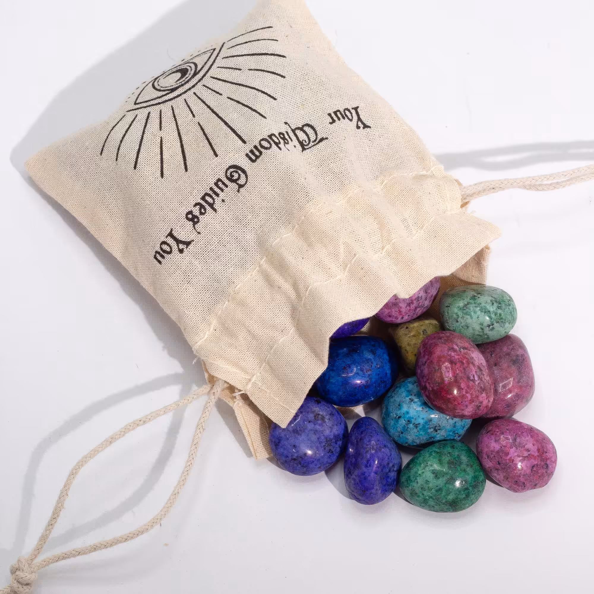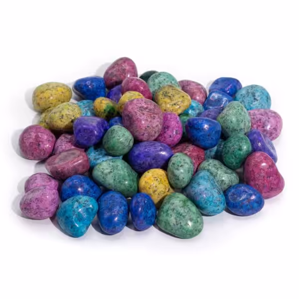 A colourful twist on the classic Dalmatian stone, this 1kg mix features approximately 70 tumbled stones treated in vivid shades of blue, green, pink, purpleand yellow. Each stone showcases the natural spotted texture of Dalmatian jasper, enhanced with vibrant colour for extra visual appeal.