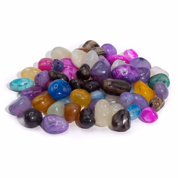 A bright and joyful mix of tumbled agate stones in seven striking colours. Each 1kg pack contains around 70 smooth, polished pieces — a perfect blend of natural and colour-treated agates that look beautiful in bowls, displaysor craft projects.