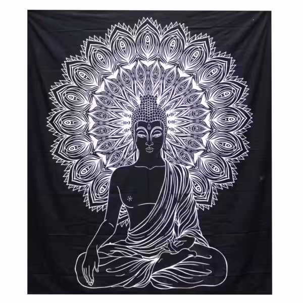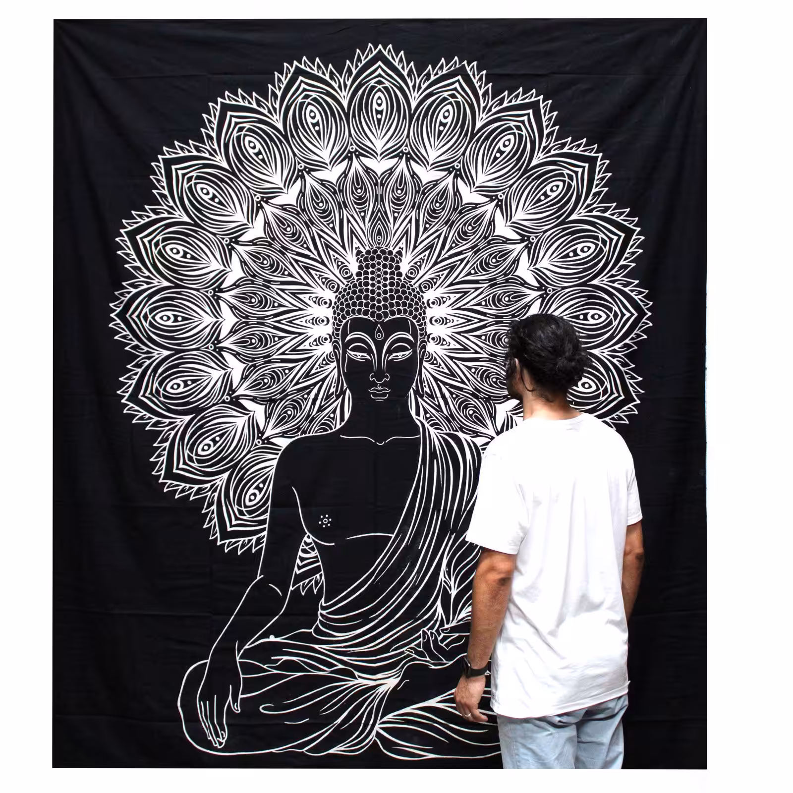 B&W Double Cotton Bedspread + Wall Hanging – Buddha