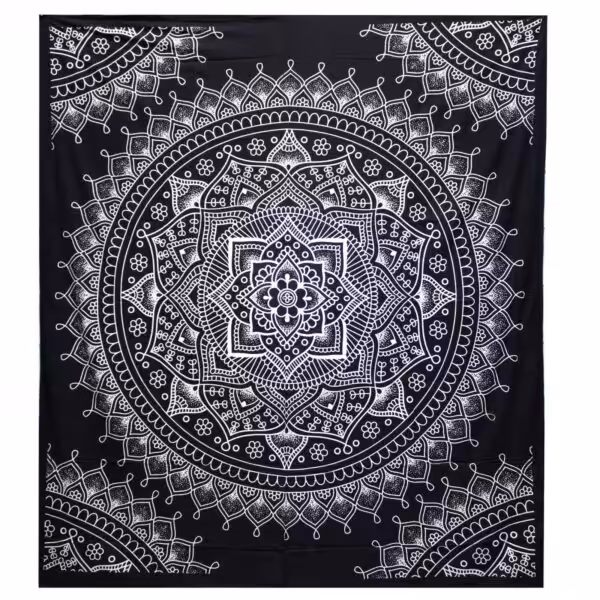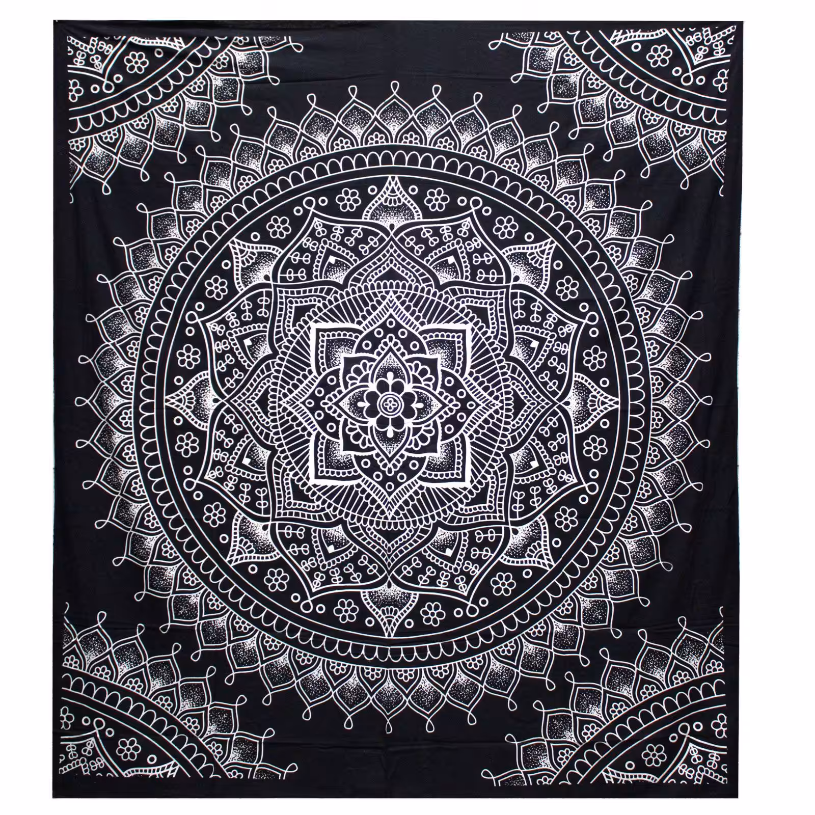This Black & White Double Cotton Bedspread Wall Hanging is a real works of art. Full of symbolic meanings taken from ancient Indian traditions, the design is printed by hand so minor imperfections can occur. Do not confuse with cheap mass produced machine printed items.