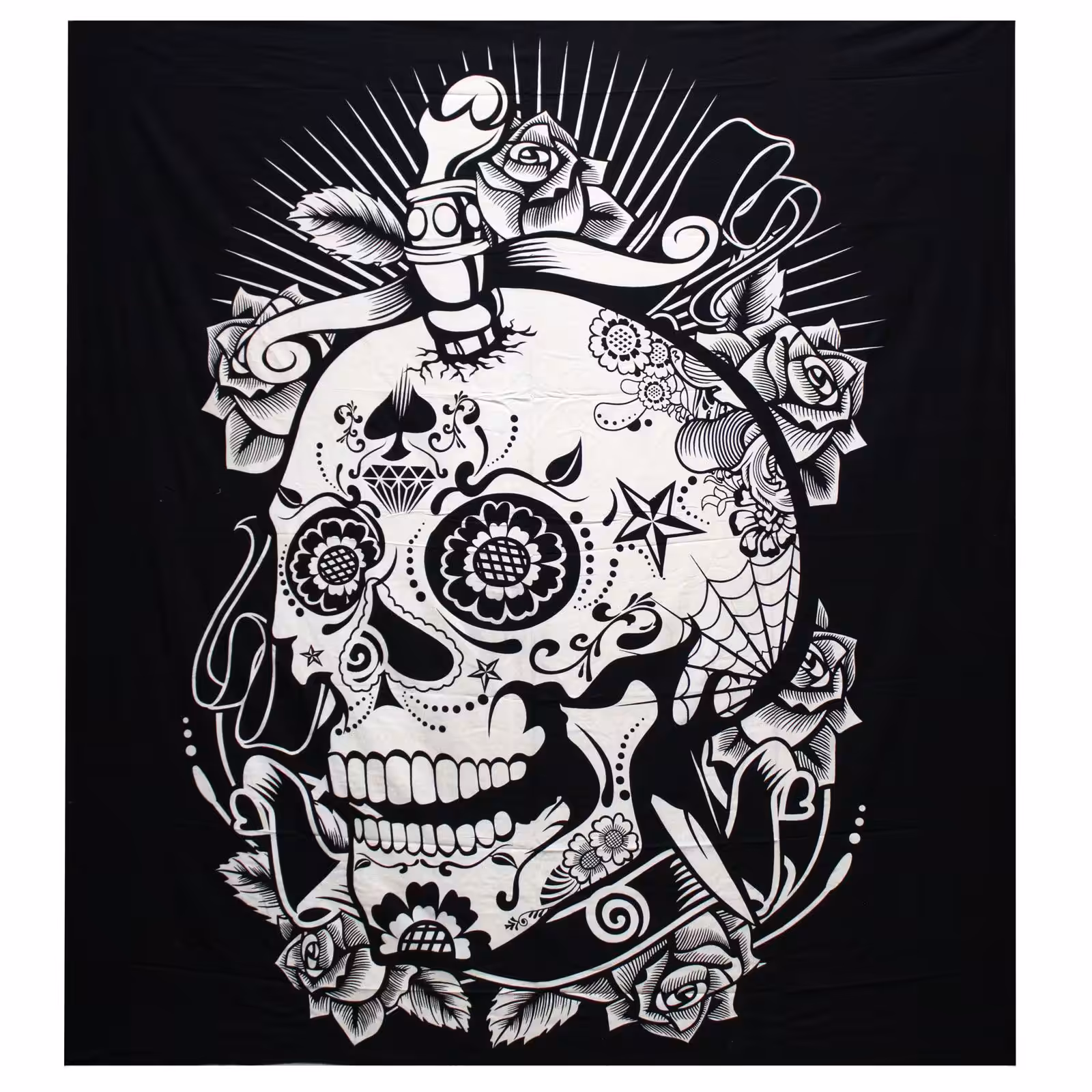 B&W Double Cotton Bedspread + Wall Hanging – Rose Skull