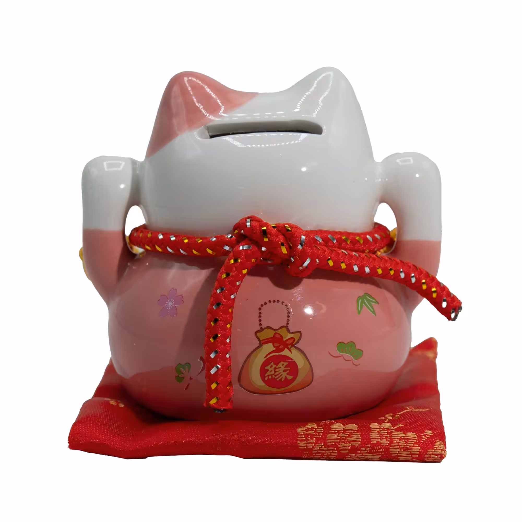 Soft, playful, and full of personality, this Ceramic Money Cat Bank adds a gentle decorative touch to shelves, desks, and gifting displays. Finished in pink and white with red and gold detailing, it sits on a patterned red cushion that gives the piece a traditional contrast.