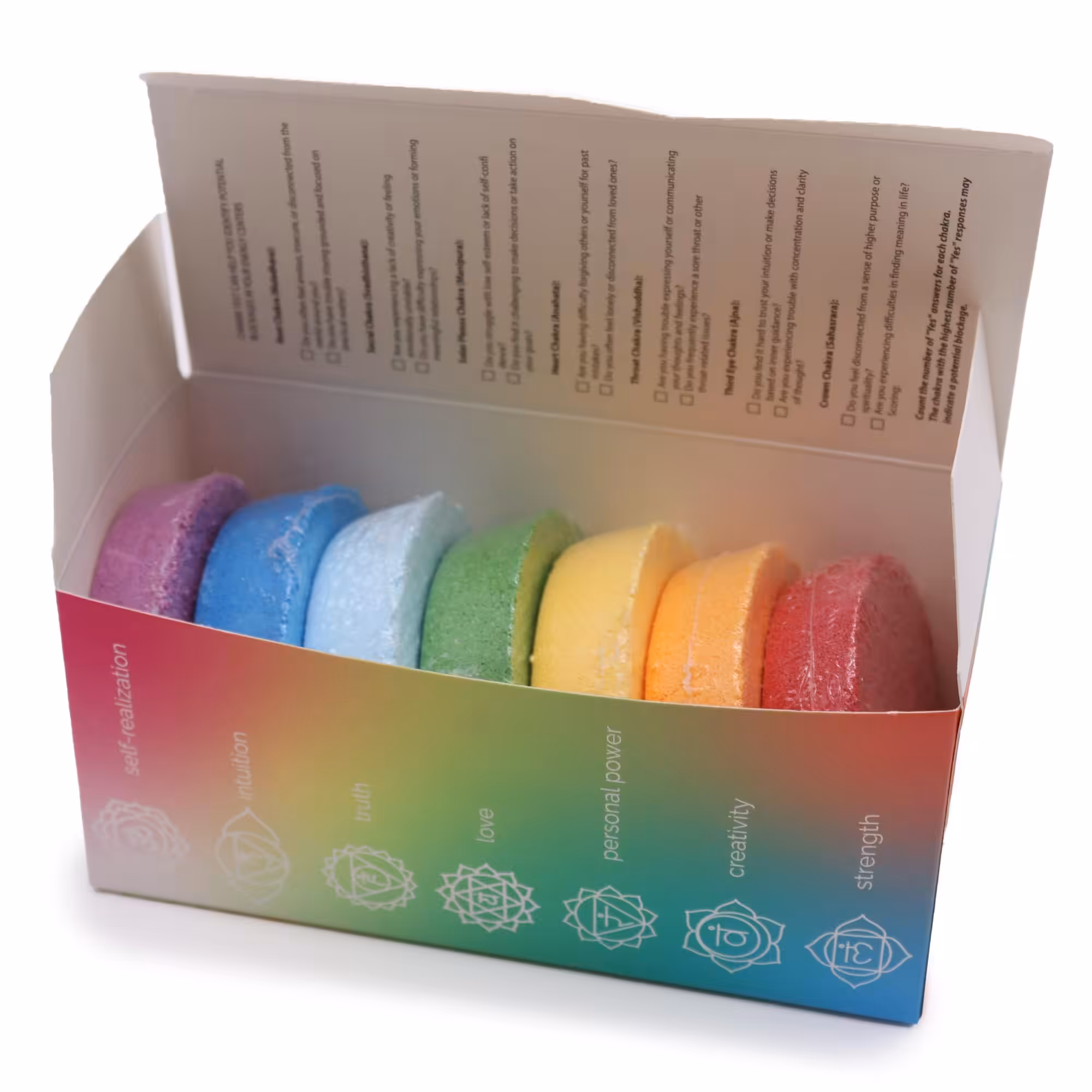 Each bath fizzer in this set not only offers a vibrant burst of colour but also delivers unique benefits tailored to each chakra. Infused with aromatic scents, these fizzers help to relieve stress, uplift your mood and create a serene atmosphere. Whether you’re seeking to unwind after a long day or simply pamper yourself, the Chakra Bath Fizz – Large Box elevates your bathing ritual into a holistic experience.