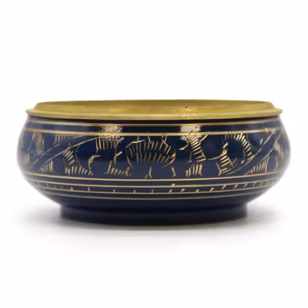 Charcoal Incense Jar in beautiful dark blue colour. Decorated with golden patterns, handmade in India. This incense jar can be used during rituals for purification or activation of the Throat chakra.