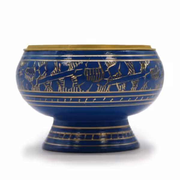 Charcoal Incense Jar in beautiful blue colour, with a slightly higher base. Decorated with golden patterns, handmade in India. This incense jar can be used during rituals for purification or activation of the Third Eye chakra.