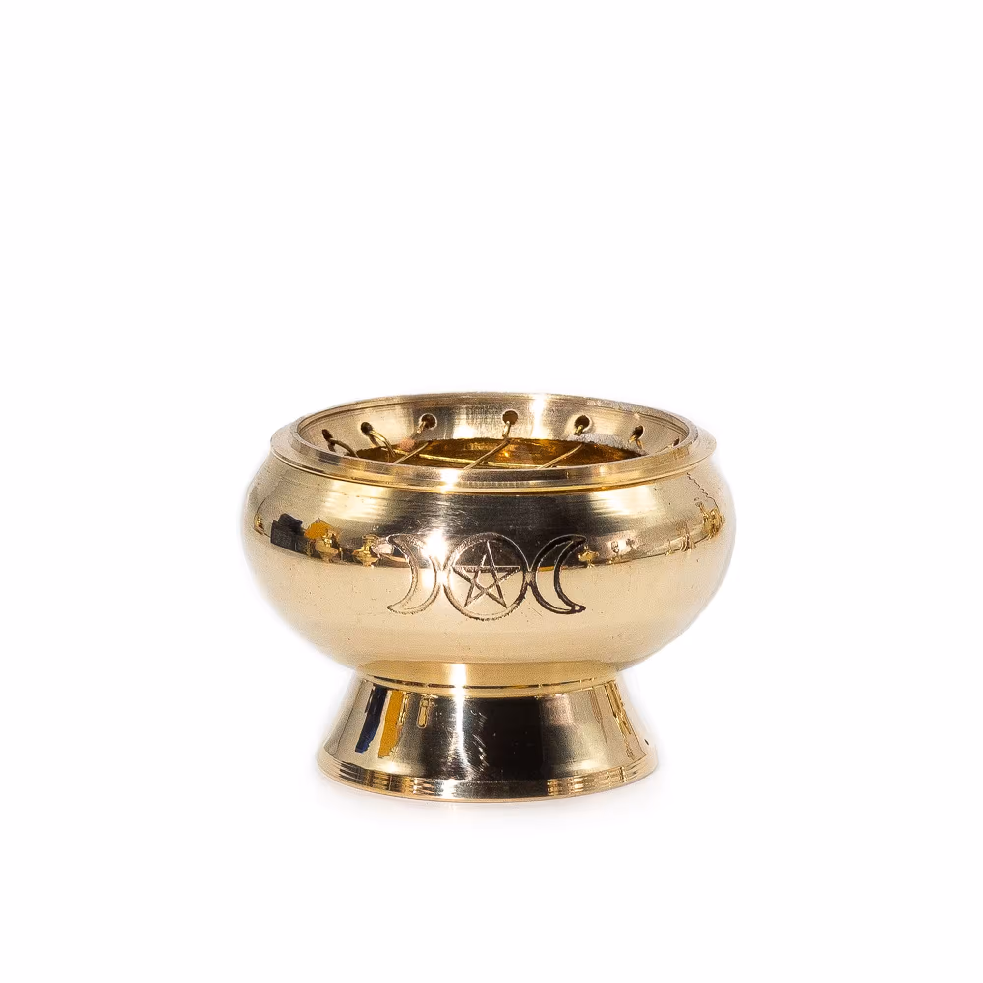 Handmade in India from solid brass, this incense jar is engraved with the Triple Moon Pentagram—a symbol of the divine feminine, spiritual balanceand protection. Compact and practical, it’s designed for safe and stylish charcoal incense rituals.