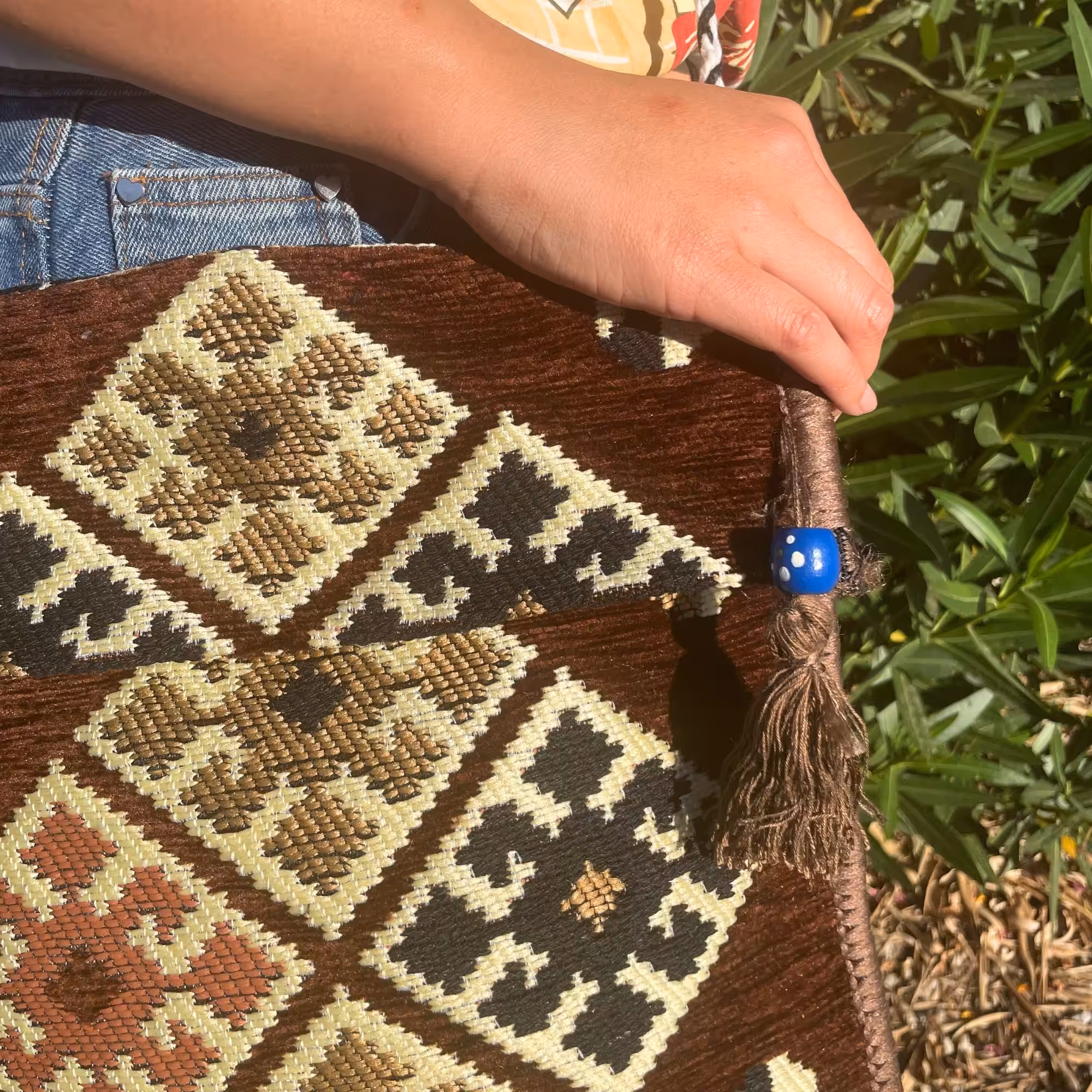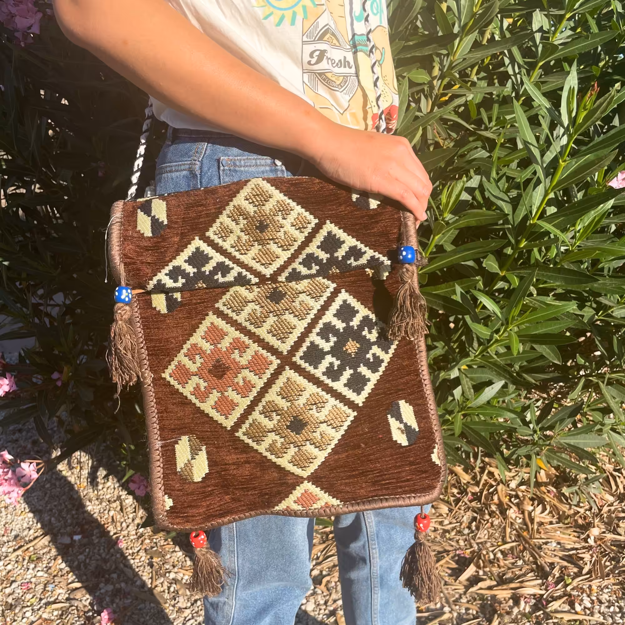 Chocolate Kilim Summer Bag. This exquisite piece combines the rich and warm tones of with the vibrant energy of a festival. Crafted through the ancient art of Kilim weaving in Turkey, it showcases intricate patterns that capture attention and evoke a sense of cultural heritage.