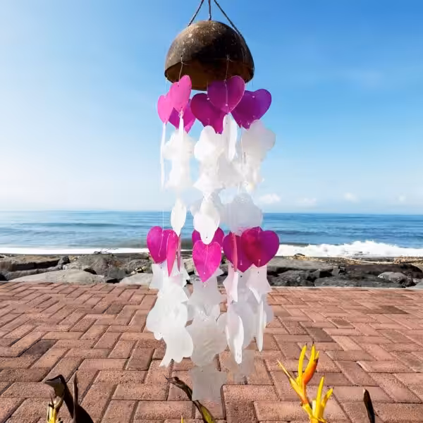 Crafted from natural materials, these windchimes feature a unique combination of coconut and capiz shells, allowing them to catch the light and create a captivating visual display. Their gentle tones evoke a sense of calm, making them ideal for relaxation spaces, meditation areas or simply as a delightful garden ornament. The harmonious blend of colours adds a pop of personality, seamlessly complementing various outdoor aesthetics.