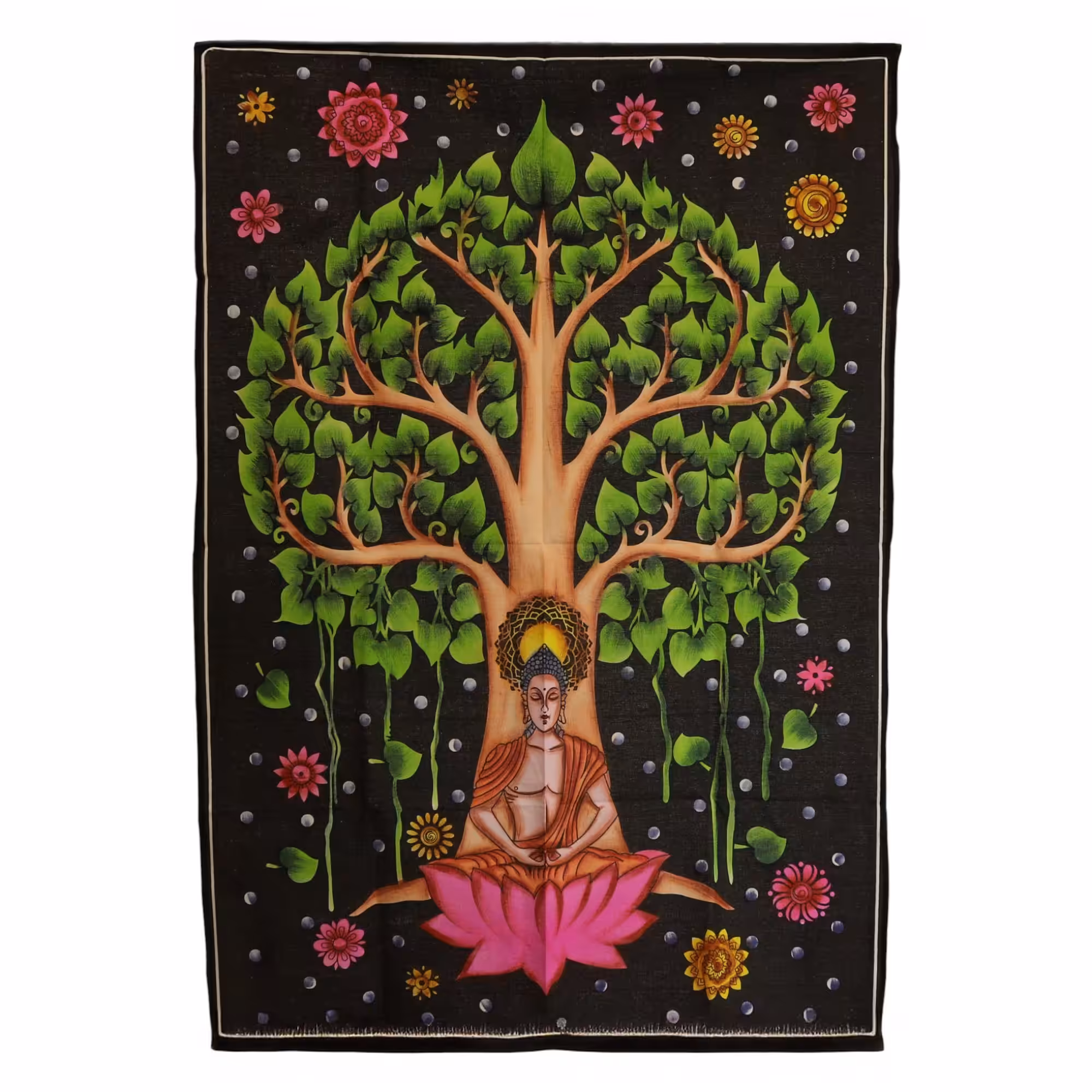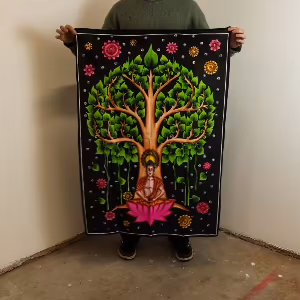 A peaceful and vibrant wall hanging featuring Buddha seated beneath the Bodhi tree. The rich greens, pinksand warm tones create a calming, spiritual presence in any room.
