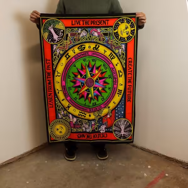 A vibrant and symbolic wall hanging celebrating the cycle of life, seasonsand time. With bold colours, zodiac signsand uplifting messages, it brings a lively, meaningful touch to any room.