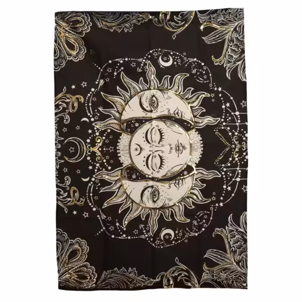 A mystical wall hanging featuring an elegant Sun Goddess surrounded by celestial details. The gold and white artwork stands out beautifully against the deep black background, giving it a bold, enchanting feel.
