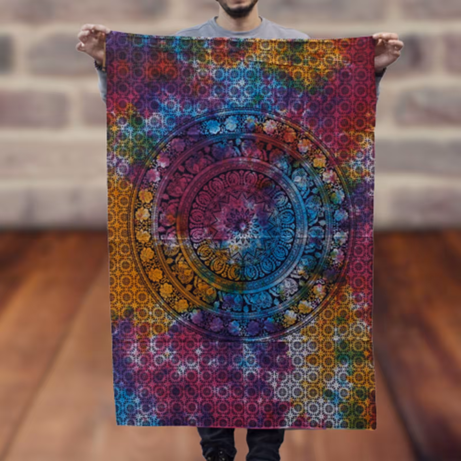 A burst of colour and pattern that instantly lifts a room. This cotton wall hanging blends a vivid mandala with a ring of small elephant motifs, creating a lively, artistic focal point.