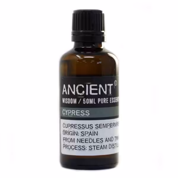 This Cypress Essential Oil is extracted by steam distillation from the Italian or Mediterranean cypress. The oil is taken from the needles and twigs of young branches of these trees made famous by the paintings of Van Gogh. Cypress essential oil is said to calm strong emotions like anger and is therefore useful to have during major changes in one's life.