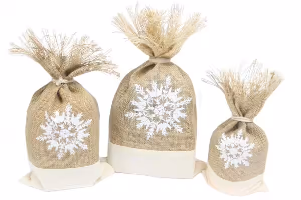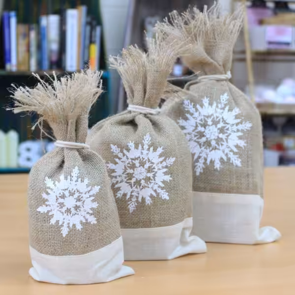 Our White & Snowflake Pouches are made of jute and are very strong and sturdy. They are perfect for use as gift bags, stocking filler giftsor to store presents.
