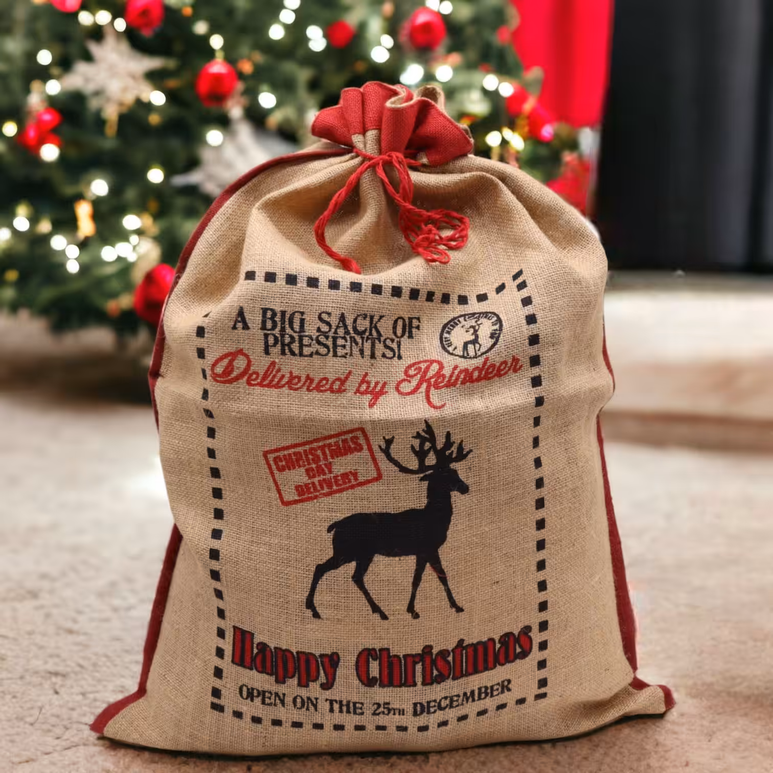 Hide the Christmas presents for your loved ones with the This Delivered By Reindeer Jute Sack.