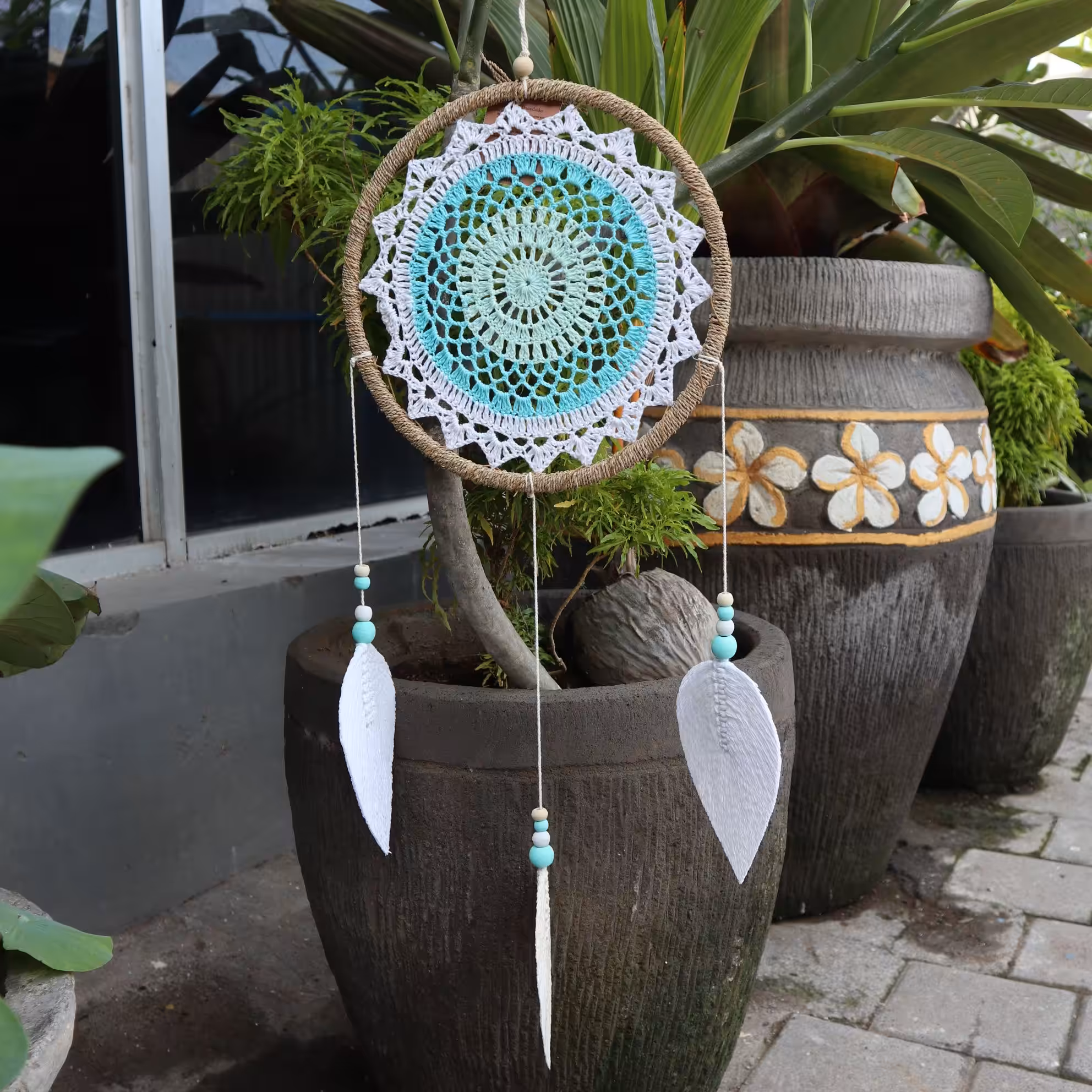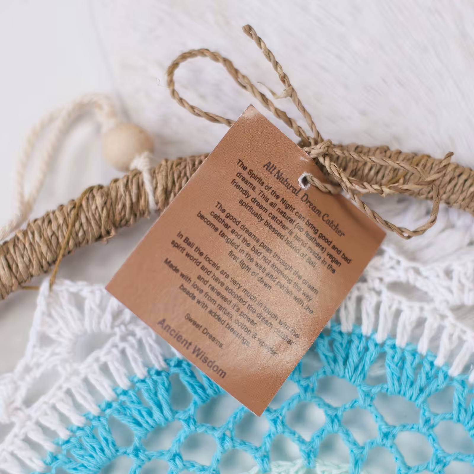 This all natural (no feathers) vegan friendly dream catcher is hand made in the spiritually blessed island of Bali.