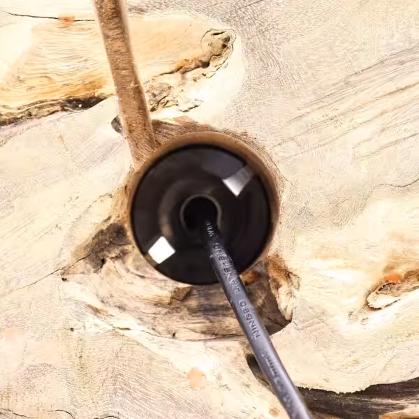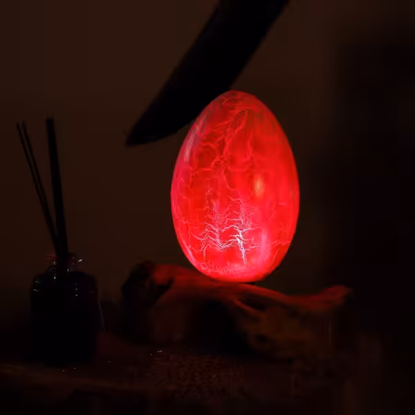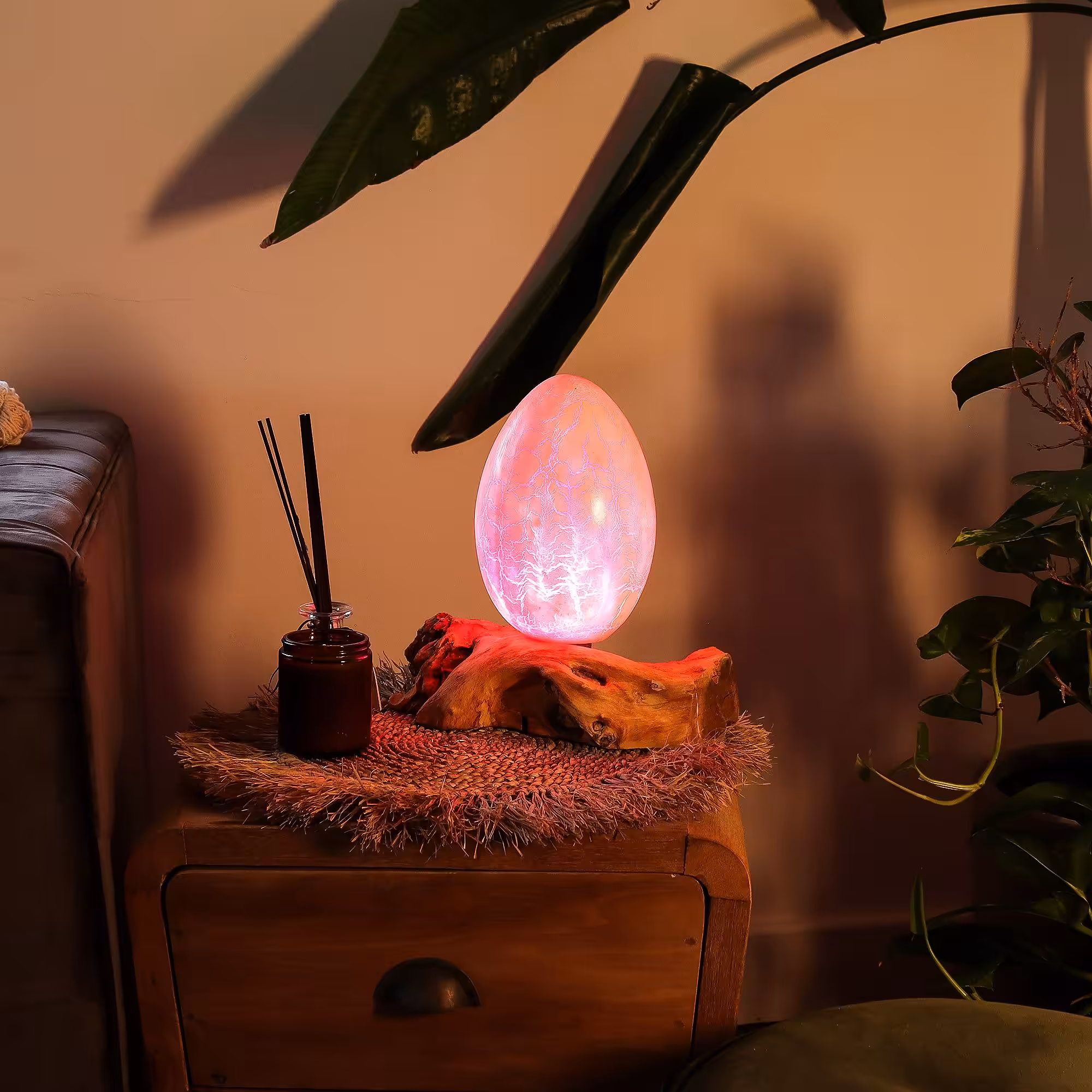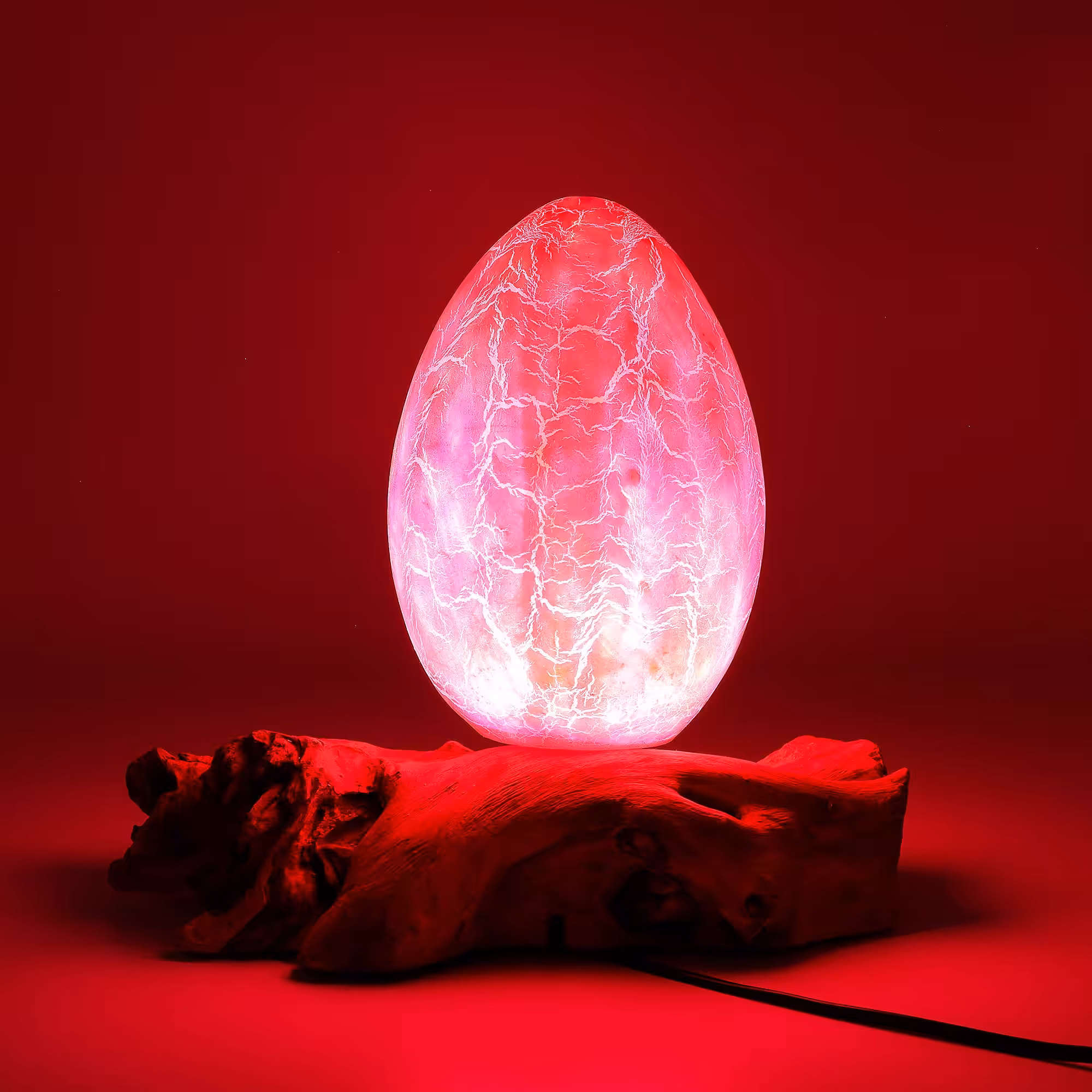 The Crackle Fire Egg DriftGlow Lamp adds a bold, glowing accent to your space, blending warm orange tones with the rugged beauty of Indonesian driftwood.