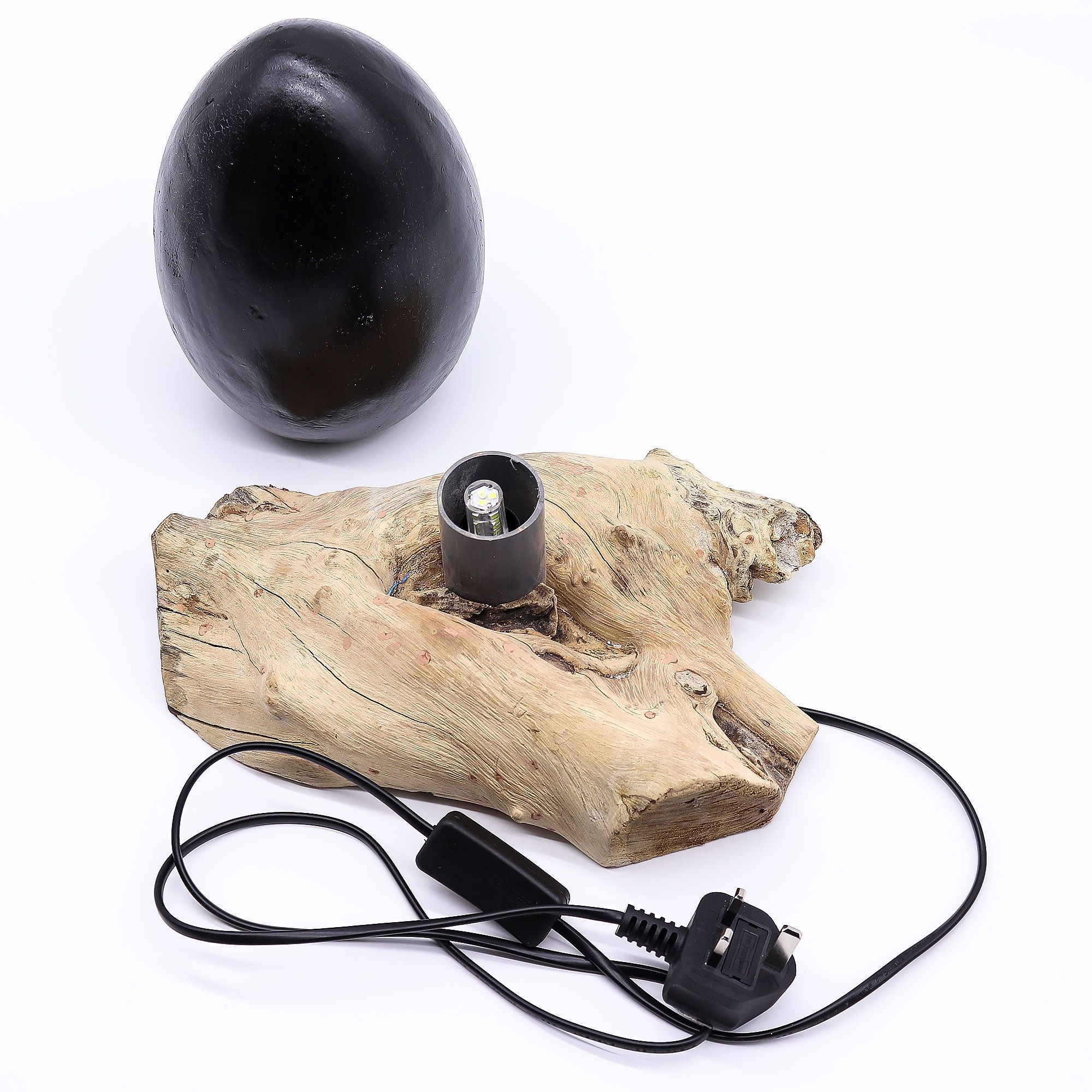 The Crackle Lava Egg DriftGlow Lamp brings a dramatic, moody glow to your home, contrasting a deep grey shade with the natural warmth of Indonesian driftwood.