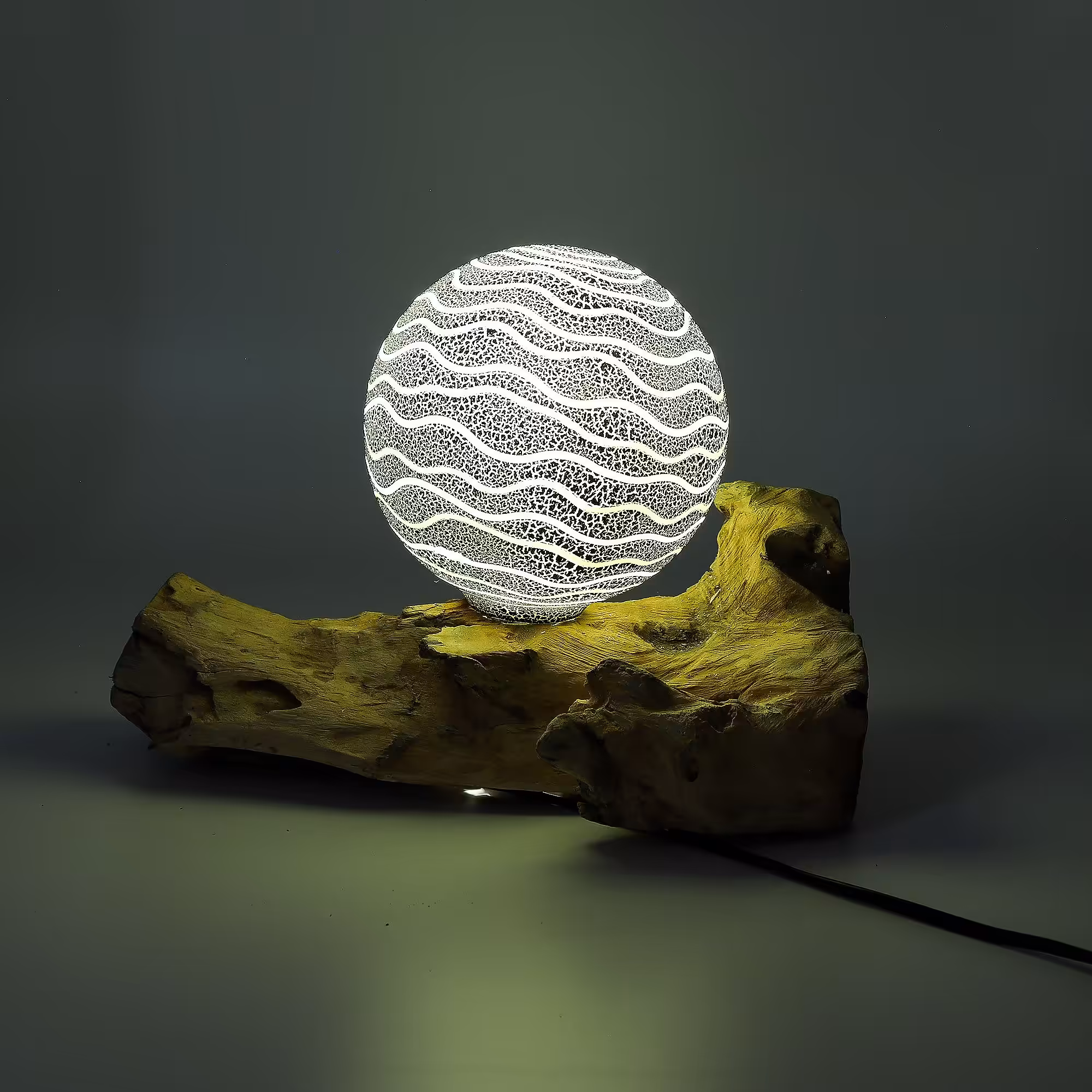 The Grey Luna DriftGlow Lamp brings a calm, atmospheric glow to your home, blending natural driftwood with a patterned grey fibreglass shade that looks striking both lit and unlit.