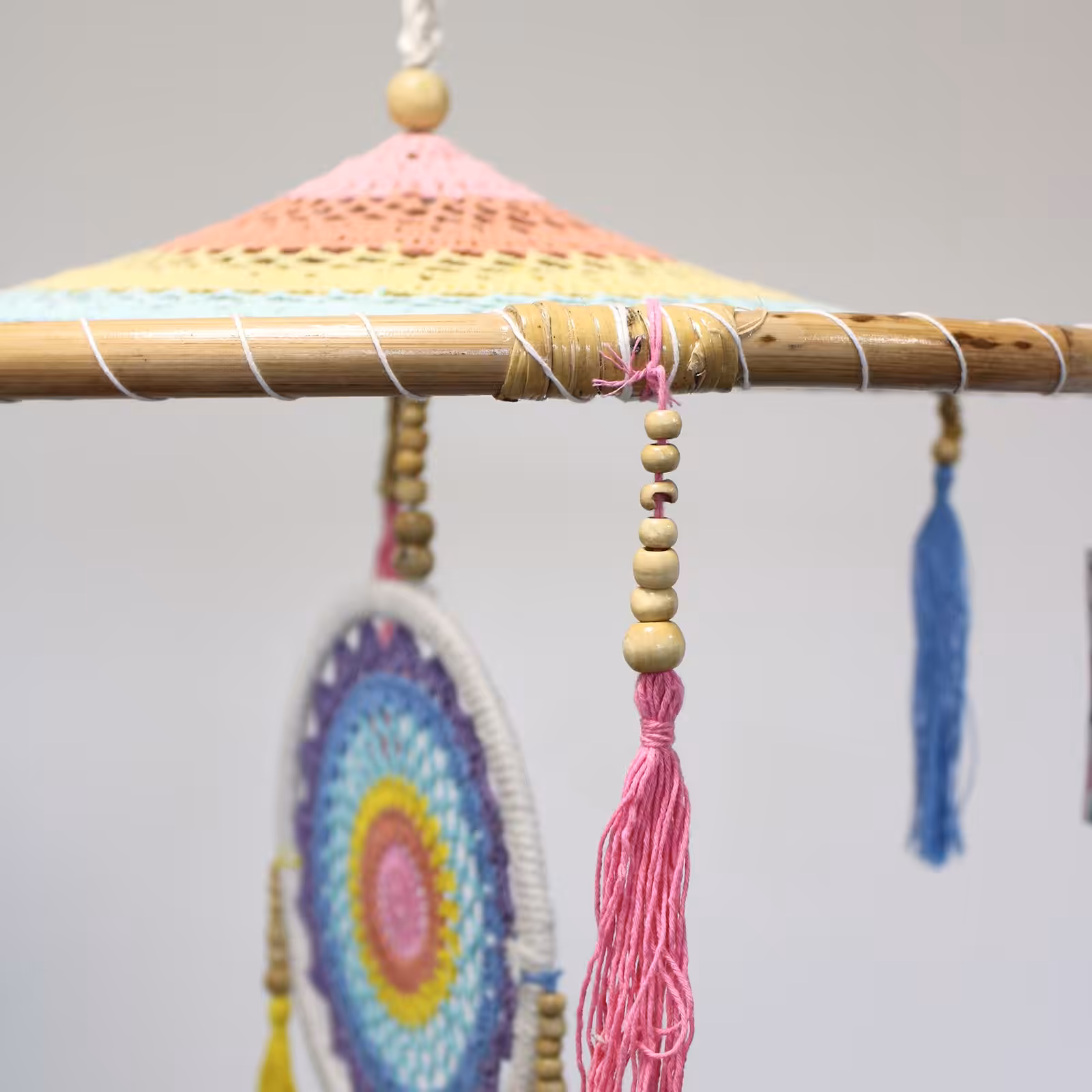 Taking the humble dreamcatcher to the next level. Inspired by the temple umbrella of Bali known as payung. Each temple has its own umbrella to trap evil spirits and attract good spirits. Different styles are used for different ceremonies. Temple umbrellas are an important part of everyday life in Bali.