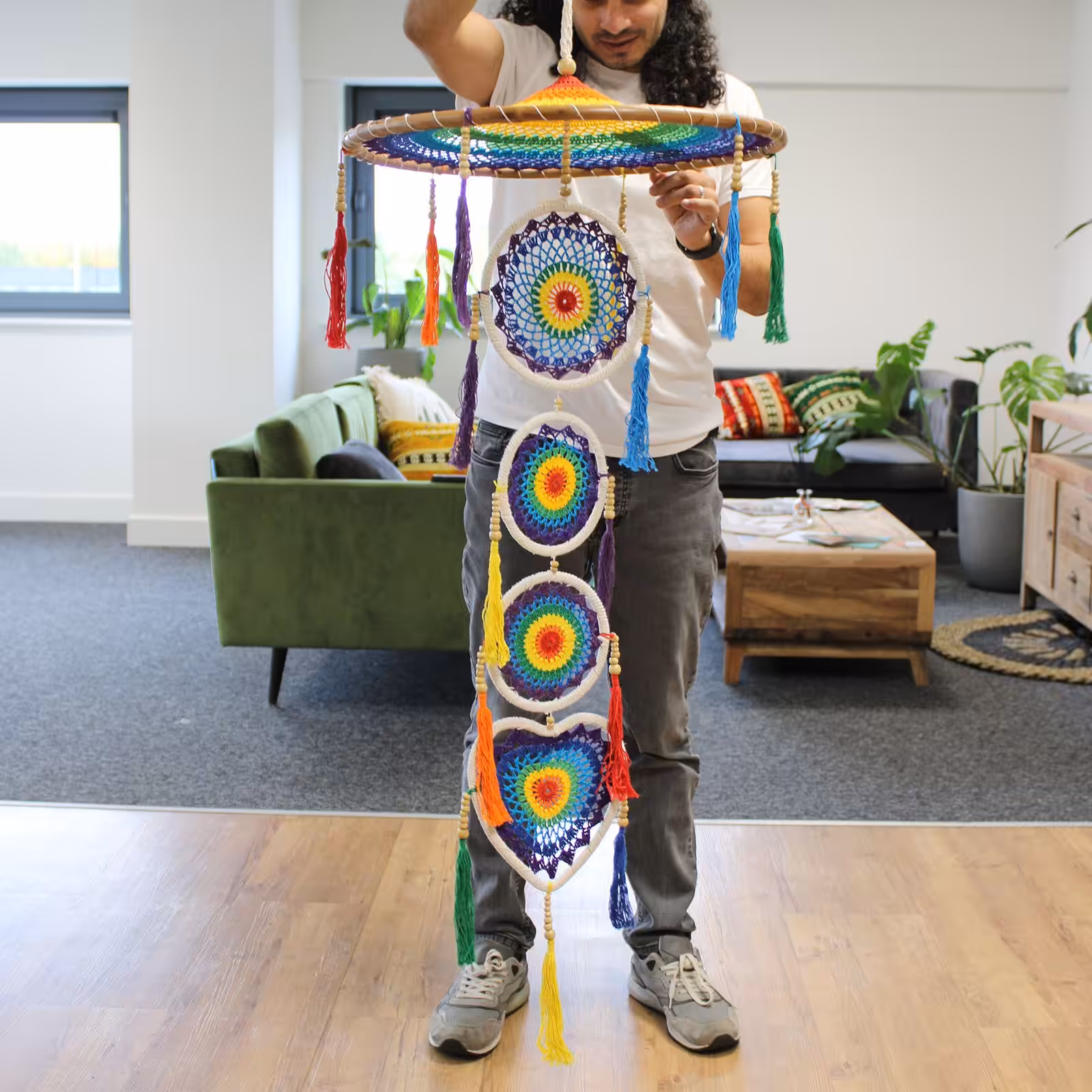 Taking the humble dreamcatcher to the next level. Inspired by the temple umbrella of Bali known as payung. Each temple has its own umbrella to trap evil spirits and attract good spirits. Different styles are used for different ceremonies. Temple umbrellas are an important part of everyday life in Bali.