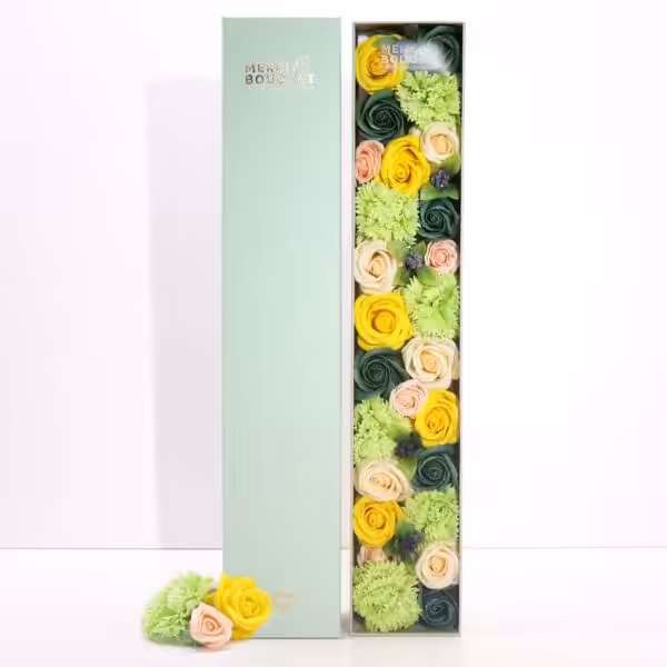 The Extra Long Box – Spring Celebrations in yellow and greens is an exquisite addition to our Soap Flower Gift Boxes collection, designed to bring a touch of elegance and charm to any gifting occasion. This beautifully arranged box showcases a stunning array of soap flowers, making it a unique and thoughtful present for birthdays, anniversaries or simply to brighten someone’s day.