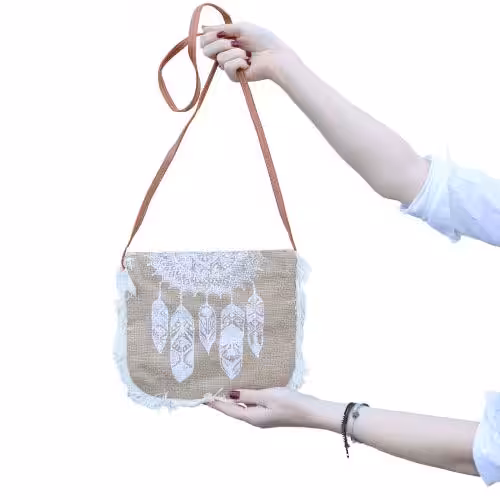 Simple but fab bag! Relaxed designs on soft washed jute with on trend screen prints or embroidered designs. A beautiful gift for anyone who loves bags.Finished with a quality (PVC) leather effect strap (112 cm), brushed cotton fringe and cotton inside lining.  You will love the fab natural look. Ethically traded and made in Bali by a…