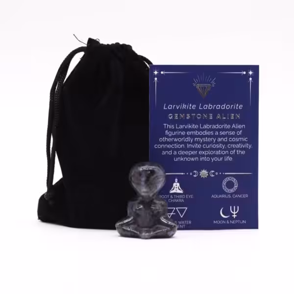 Meet the Gemstone Alien – Larvikite Labradorite, a captivating figurine that embodies a sense of otherworldly mystery and cosmic connection. Crafted from the Larvikite Labradorite gemstone, this alien-inspired piece offers a unique and intriguing exploration of the unknown.