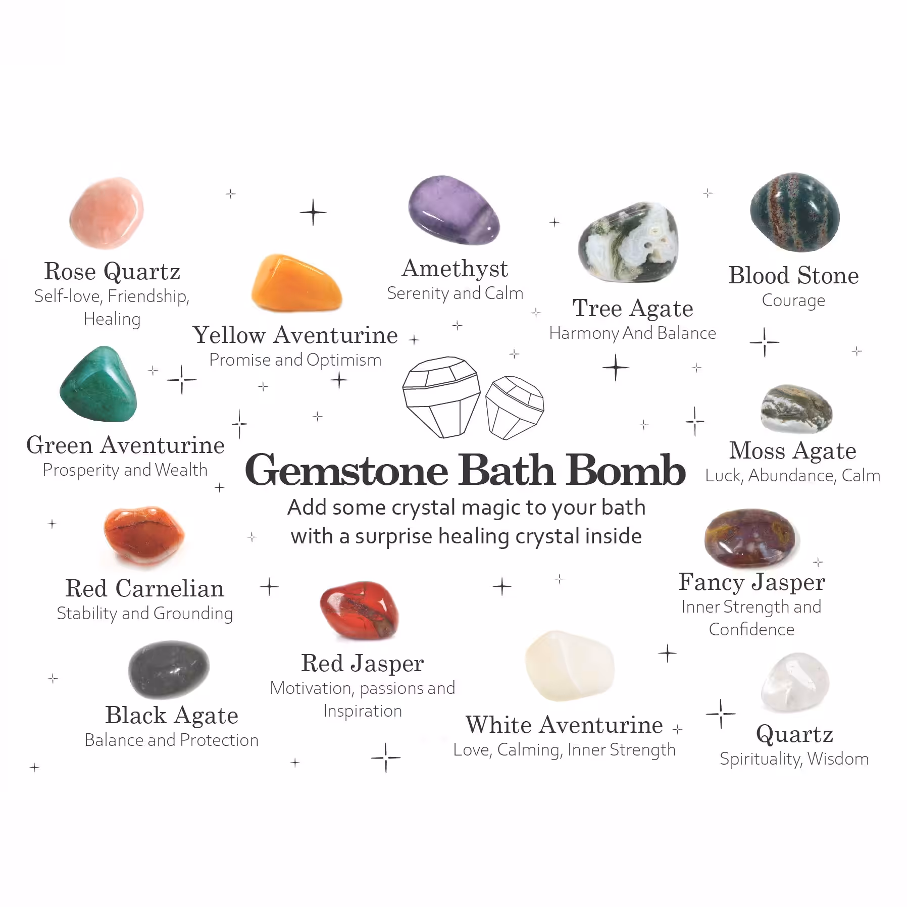 Gemstones that we put in our bath bombs are carefully selected and there are as many as 13 types. There's only one way to find out what gem awaits inside. Your customers will have to take a bath to find out – surprise! Each stone has unique properties, which we described in the leaflet attached to the set.