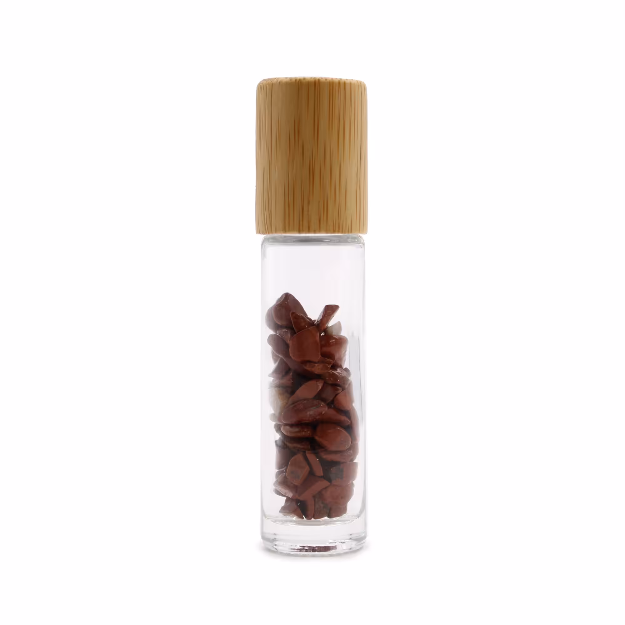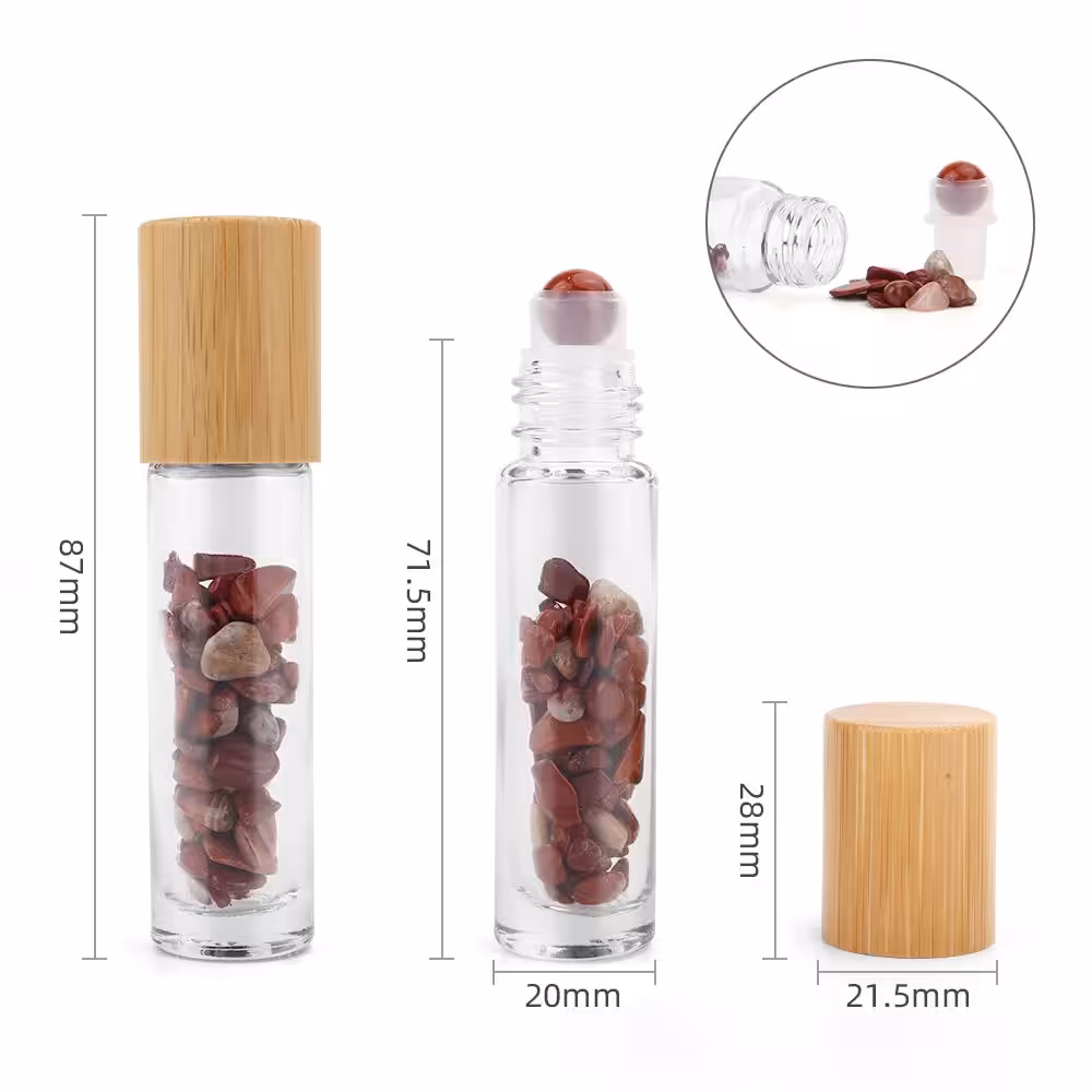The roll-on bottle allows the oils to be applied precisely and easily to the skin. The ball is made of smoothly polished red jasper. The stones placed inside provide a unique visual effect, it is also believed that they enhance the effect of the given mixture.