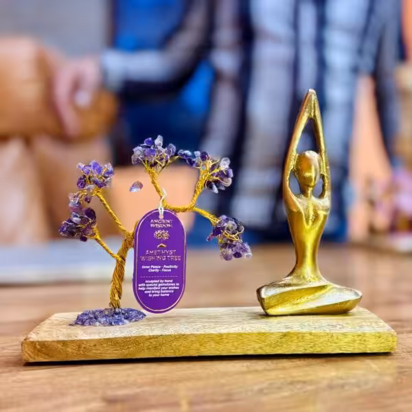 The Amethyst Gemstone Yoga Garden – Tilted Tree in Sukhasana Pose is an exquisite handcrafted piece that blends spiritual balance with artistic elegance.