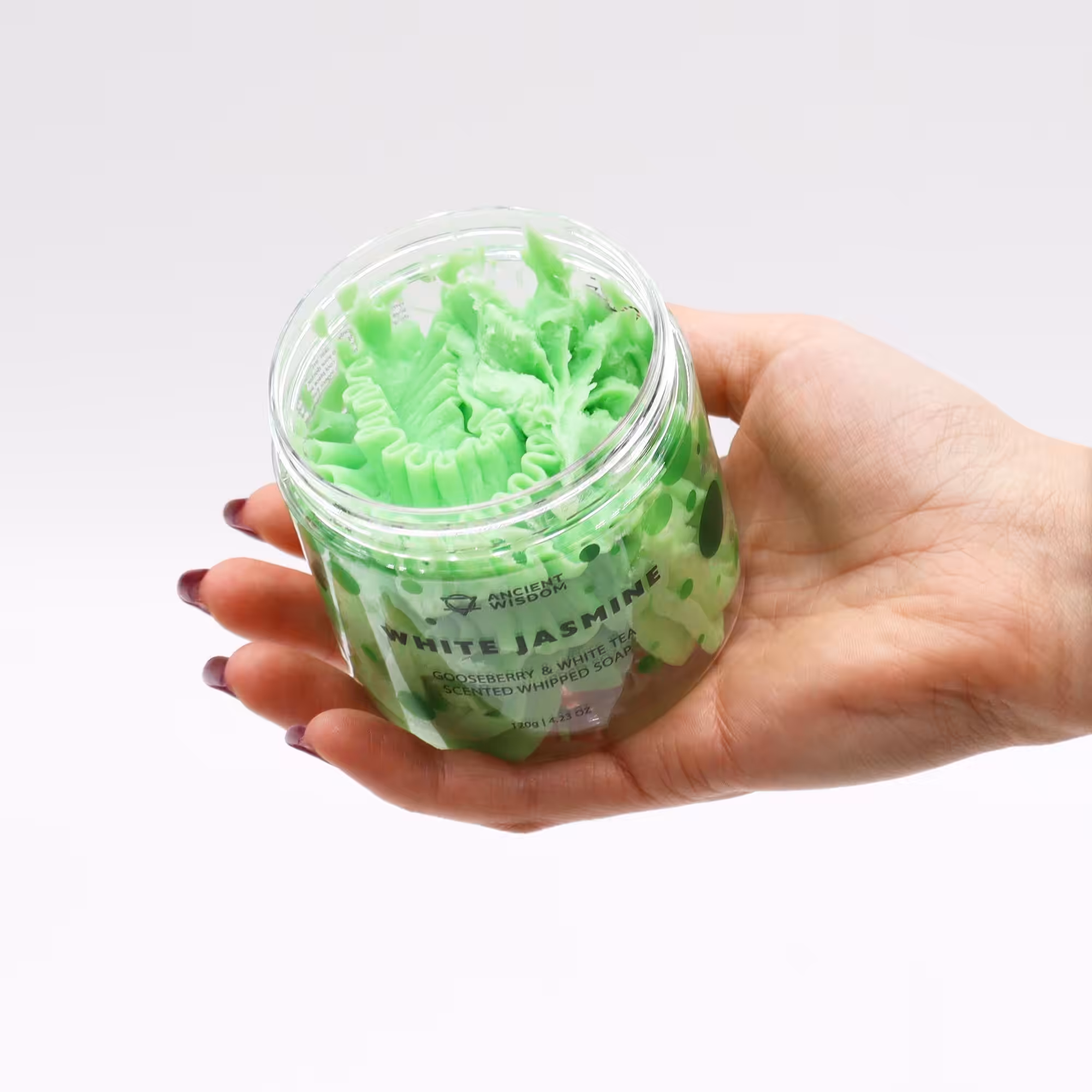Exquisite White Jasmine Whipped Soap – Immerse yourself in the captivating blend of tart gooseberries and delicate white tea while treating your skin to a luxurious and rejuvenating bathing experience.
