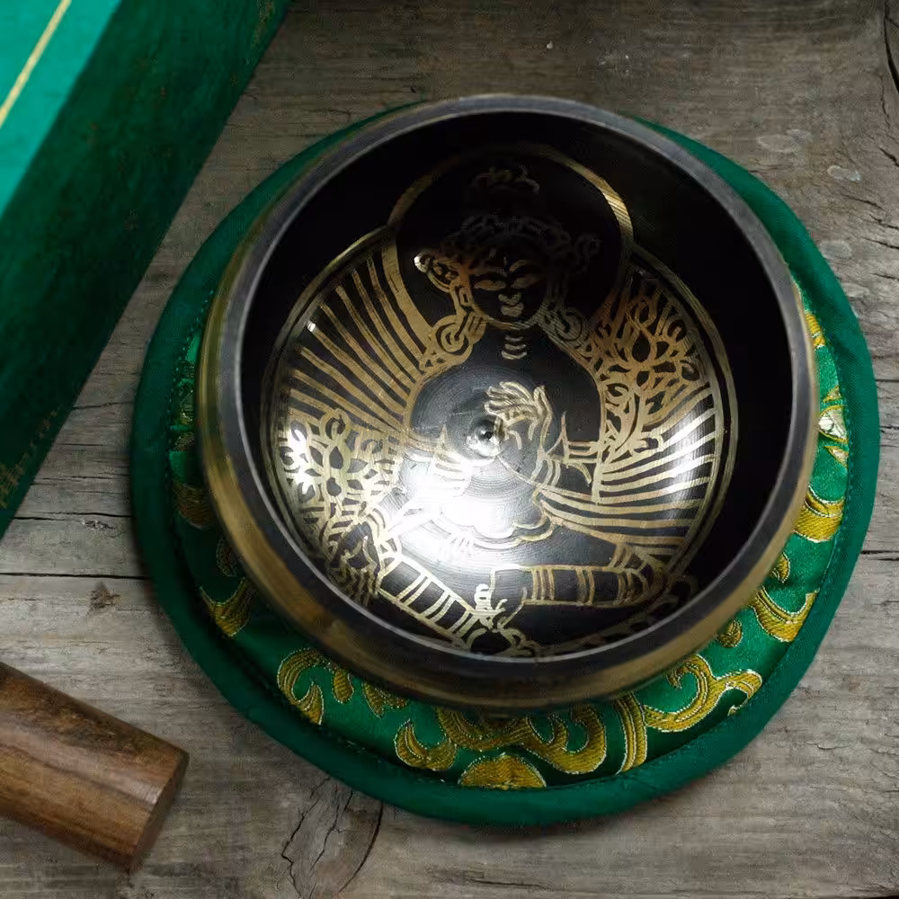 Green Tara Singing Bowl, the Green Tara is usually depicted as a compassionate being ready to step down from Lotus throne to offer comfort and protection from all of the sufferings we experience in the world. She is known as the Mother of all Buddhas and is the for the female spirit of compassion, longevity and through this power, love.