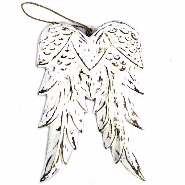 Beautiful Angel Wings.  Vintage style in distressed wood. Hand carved in Bali from sustainable albesia wood and finished in white washed process for Ancient Wisdom. Each decoration is distressed by hand giving each piece it's own uniqueness.These pretty angel wings make a lovely gift or home decoration, looking pretty hanging on a wall or door or…